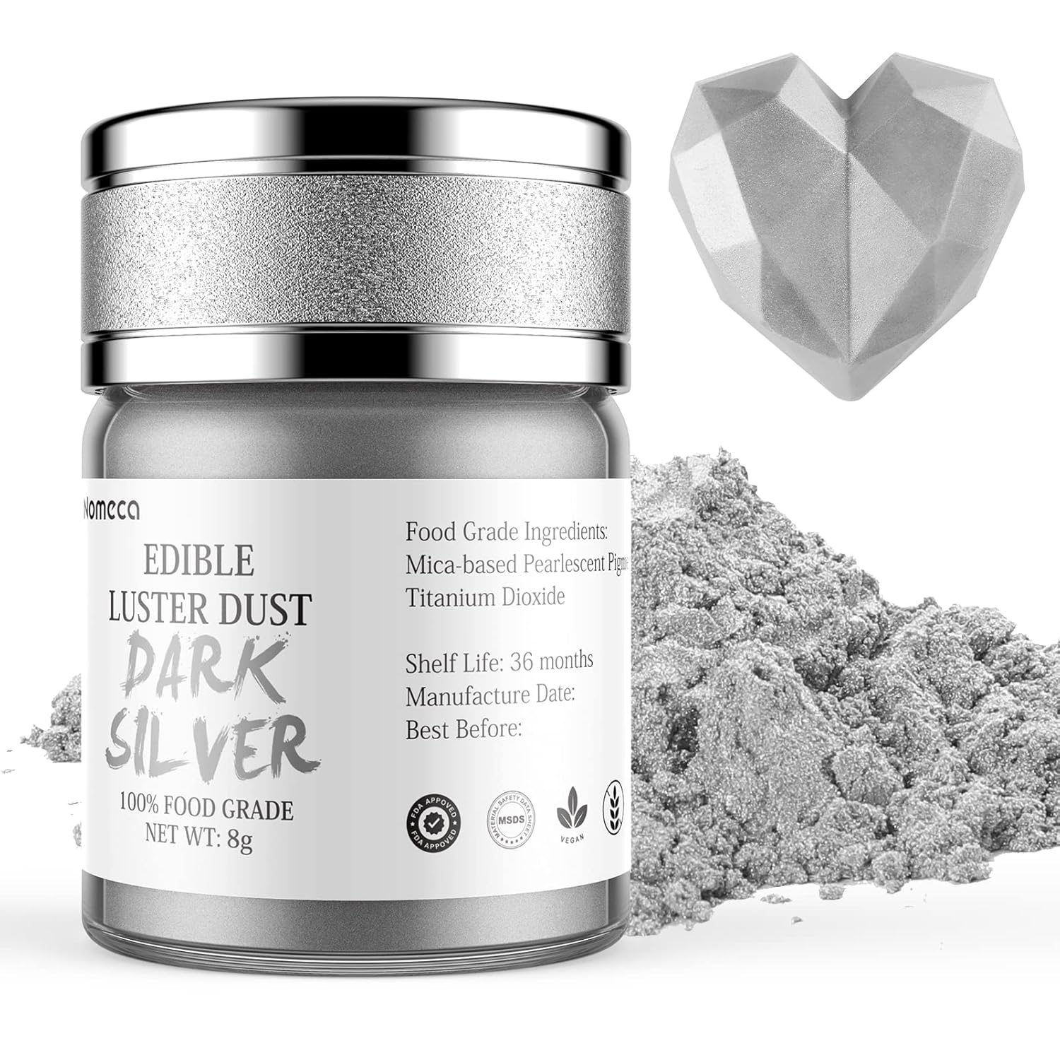 Nomeca Edible Luster Dust, 8 Grams Food Grade Shimmer Gold Cake Dust Metallic Food Coloring Powder for Cake Decorating, Baking, Fondant, Gumpaste, Chocolate, Candy, Drinks, Cookies - Dark Silver