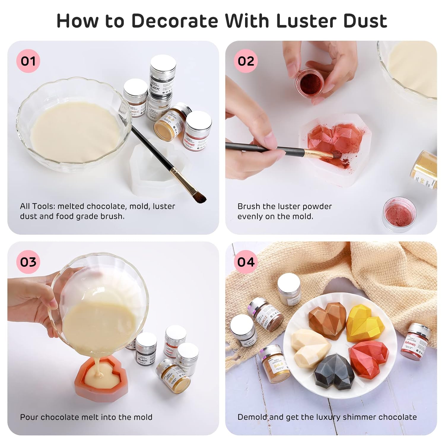 • SAFE & EDIBLE LUSTER DUST -- Adopt food grade ingredients (Mica-based Pearlescent Pigments, Titanium Dioxide), non toxic and edible, no flavor, won't change the taste of your recipe