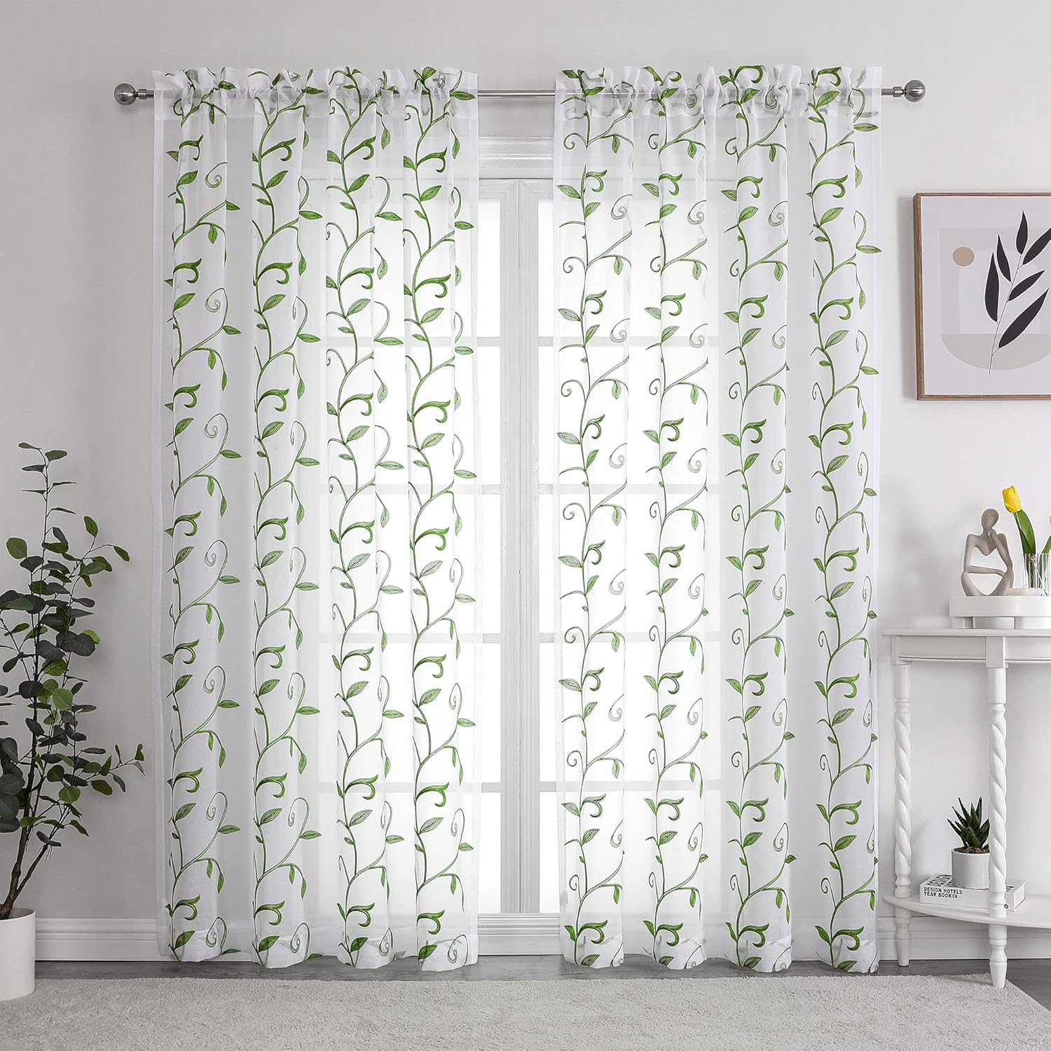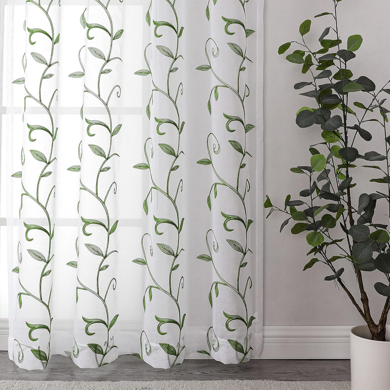 VISIONTEX Embroidered Green Sheer Voile Curtains, Leaves Embroidery Faux Linen Rod Pocket Window Drapes for Living Room and Girls Bedroom 54 x 95 Inch, Set of 2 Curtain Panels