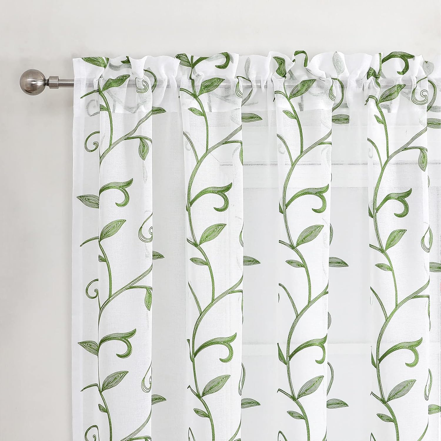 VISIONTEX Embroidered Green Sheer Voile Curtains, Leaves Embroidery Faux Linen Rod Pocket Window Drapes for Living Room and Girls Bedroom 54 x 63 Inch, Set of 2 Curtain Panels