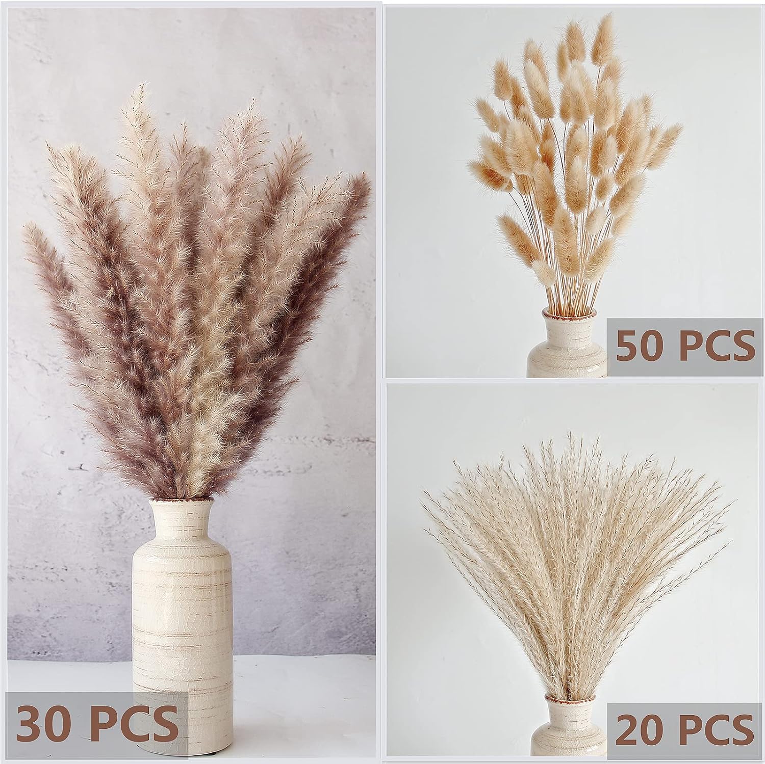 • More then one kind of pampas grass : carefully selected natural dried pampas grass decor, try to avoid deformation and breakage of dried pampas grass, 100 pieces of pampass grass contain 50 small pampas grass, 20 reed grass, 30 brown pampas grass decor, (pampas grass vase not included) fill your vase, you can match it with different fall decor floral bouquets according to your preferenc
