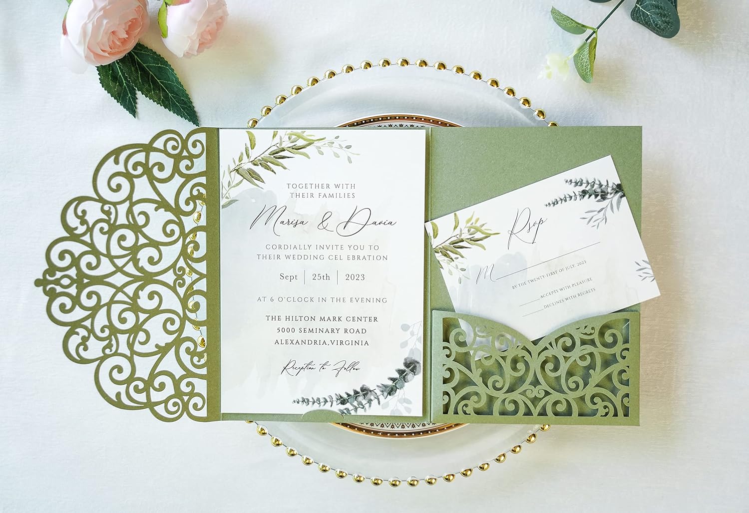 • 🥂【Occasion】Sage Green laser cut wedding invitations cards is perfect for wedding, sweet 16, engagement, anniversary, festival, bridal, baby shower, birthday graduation, ect.