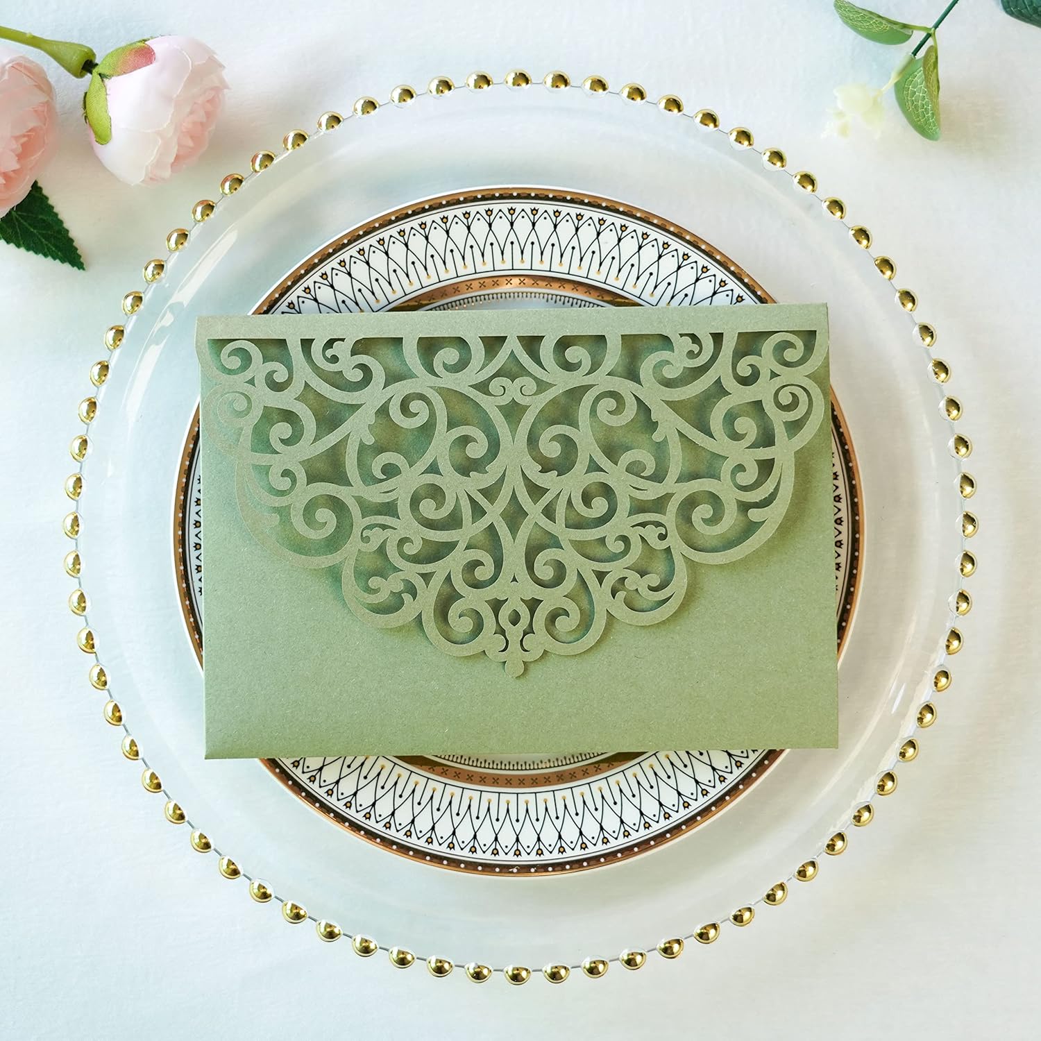 • 🥂【Package included】20 PCS Sage Green Laser Cut Invitations POCKETS + 20 PCS Cream White Envelopes, NO INNER SHEETS.