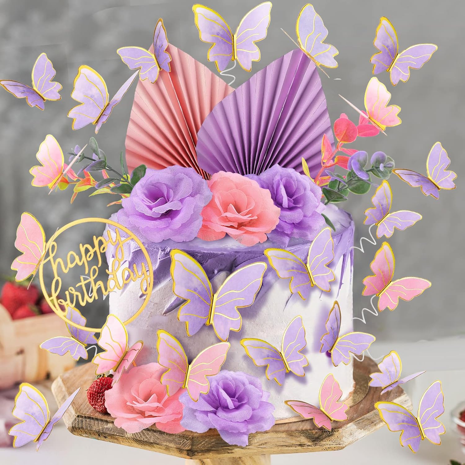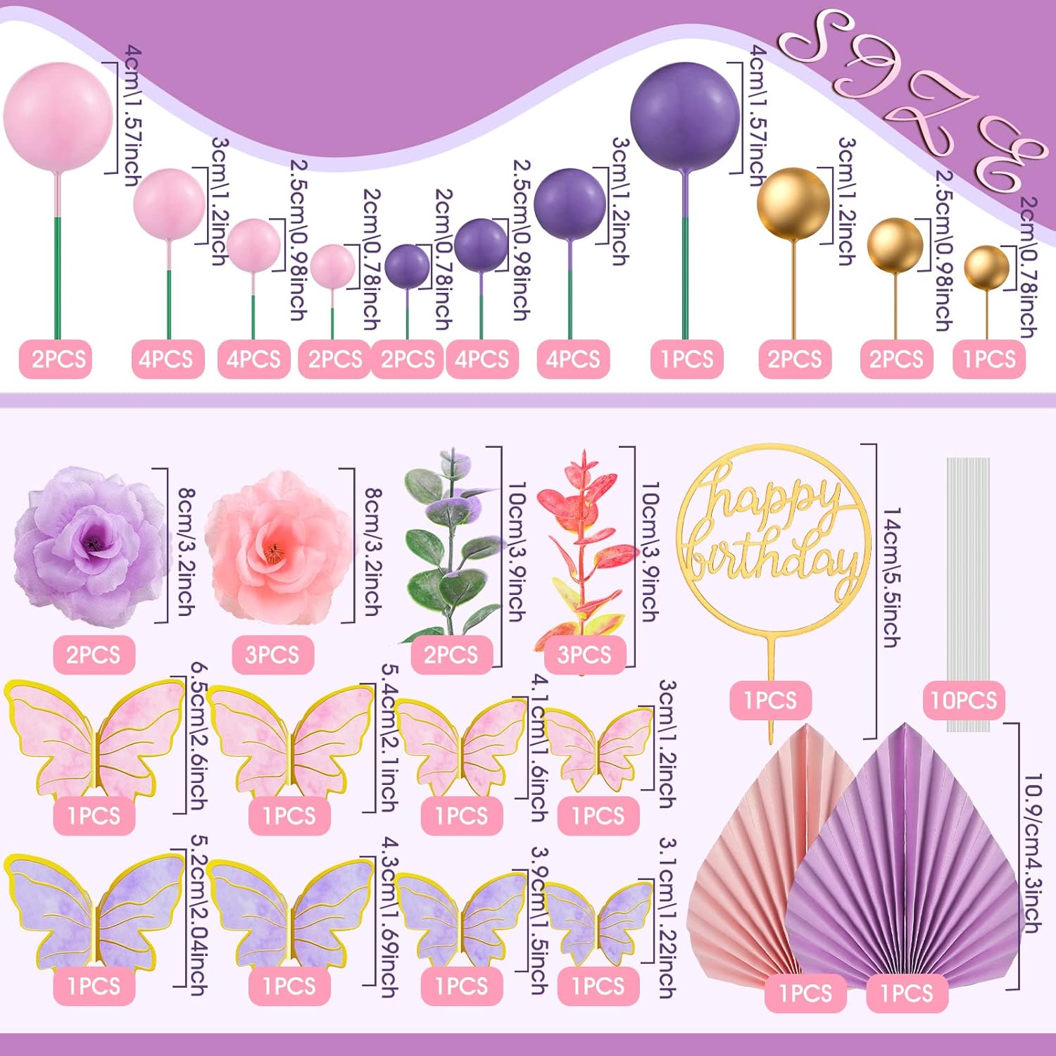 • Cake Decorations: the package comes 2 palm leaves, 1 happy birthday cake topper, 5 fake flowers, 2 fake wheat branches, 12 butterflies, 30 balls (5 pieces of 1.6 inch, 10 pieces of 1.2 inches, 10 pieces of 1 inch and 5 pieces of 0.78 inch), a total of 52 pieces of cake decorations, sufficient quantity and various styles can meet your decorative needs for cakes