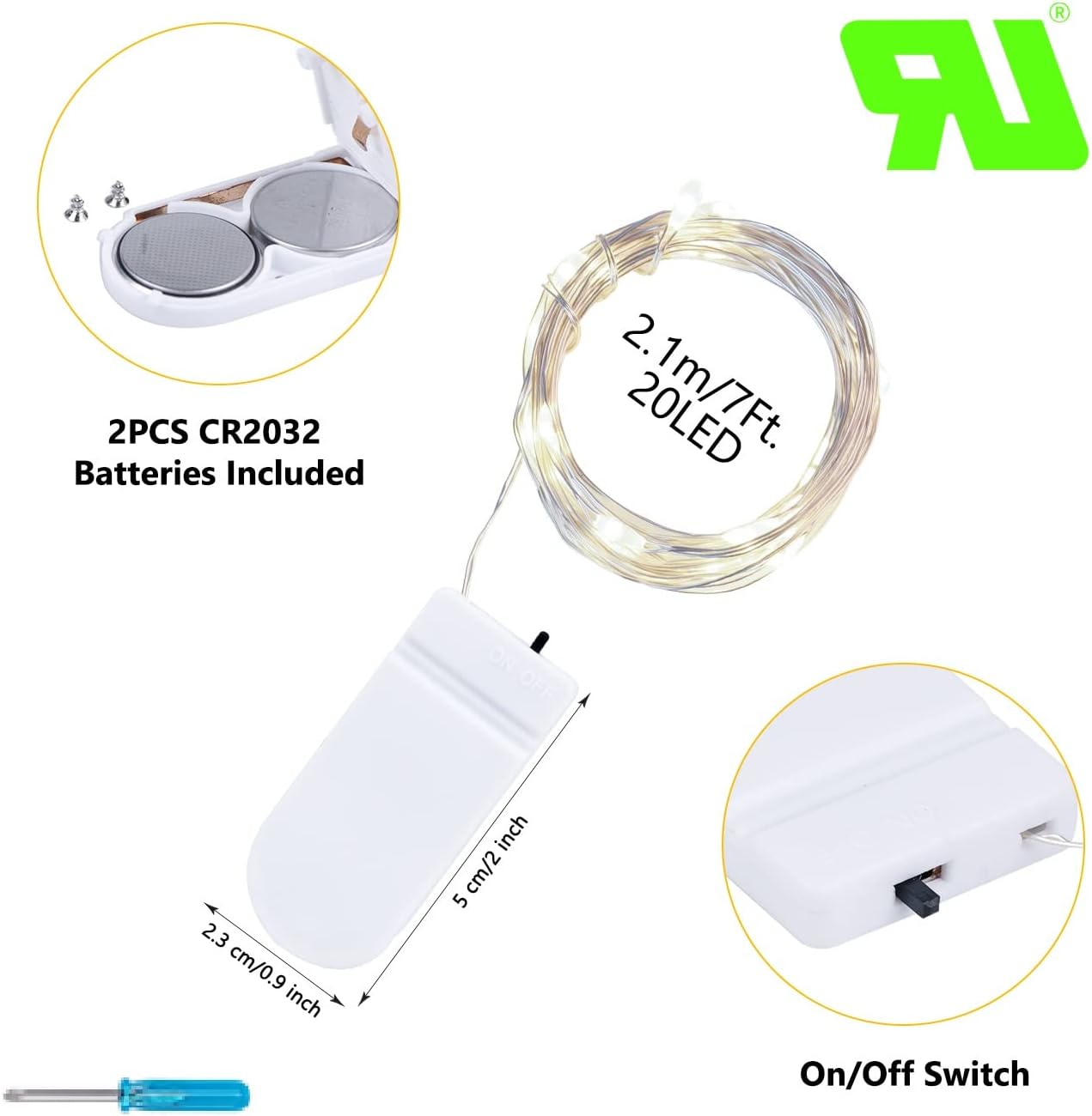 • 【 24 Pack Battery Operated LED Fairy Lights 】- Powered by 2 CR2032 batteries (included), the 7 feet micro fairy light with 20 upgraded energy-efficient LEDs is perfect for both everyday decorations as well as holiday decor. The thin copper wiring and small -sized LED bulbs will add a delicate and cozy touch to your personal space.