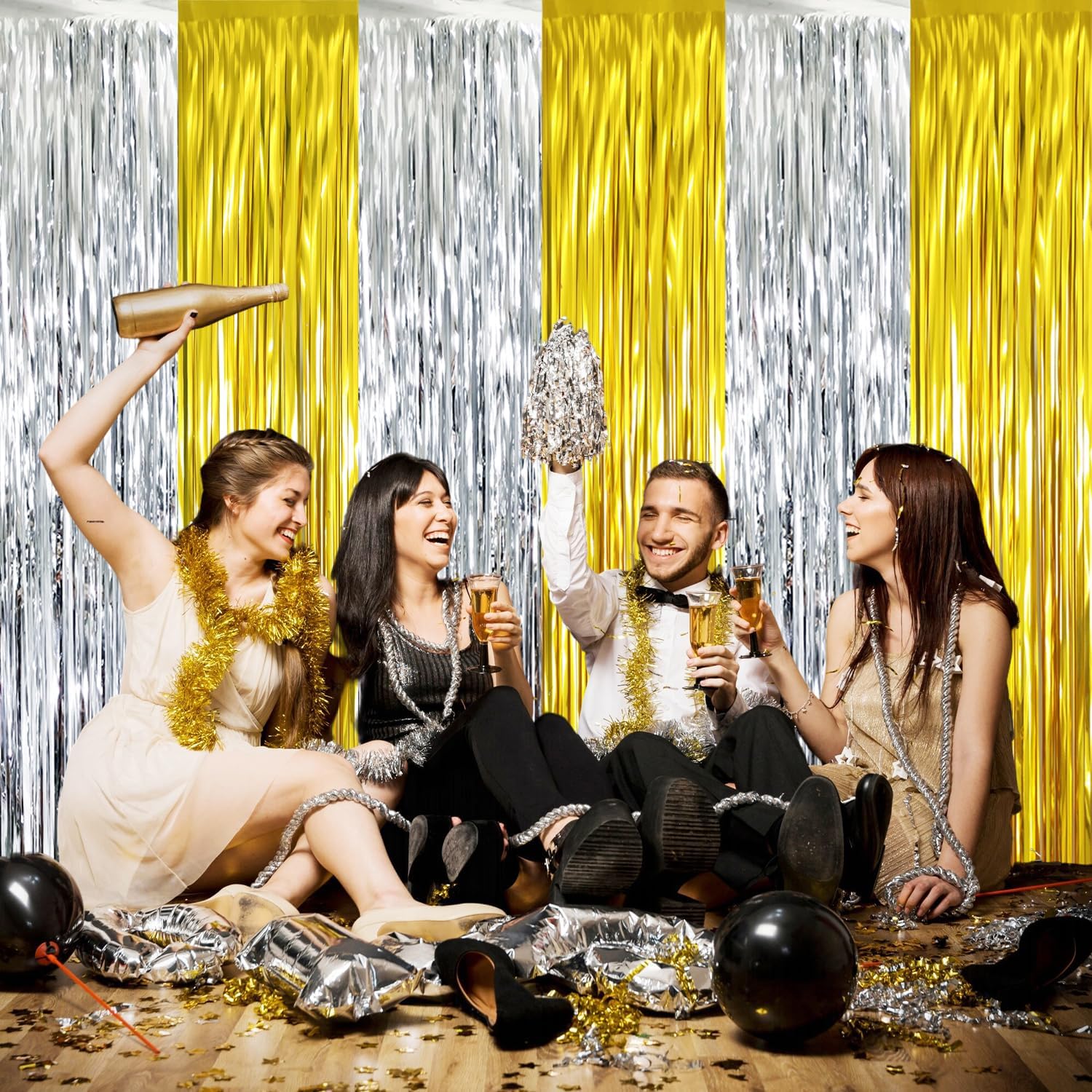 • Package Includes:2 pack Gold&Silver foil fringe curtains,3.2 ft x 8.2 ft each,suitable for hanging on a door or coverage a wall fully