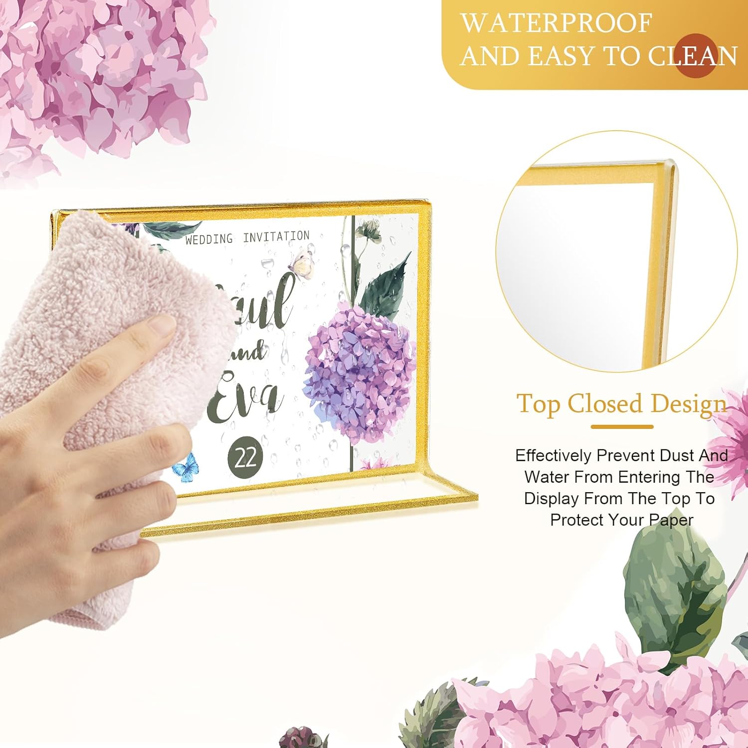 • Stable, Elegant & Eye-Catching: Featuring a sturdy L-shaped base and refined gold-edged trim, this acrylic frames stays securely in place while enhancing any display. Perfect for weddings, restaurants, business events, retail stores, and receptions