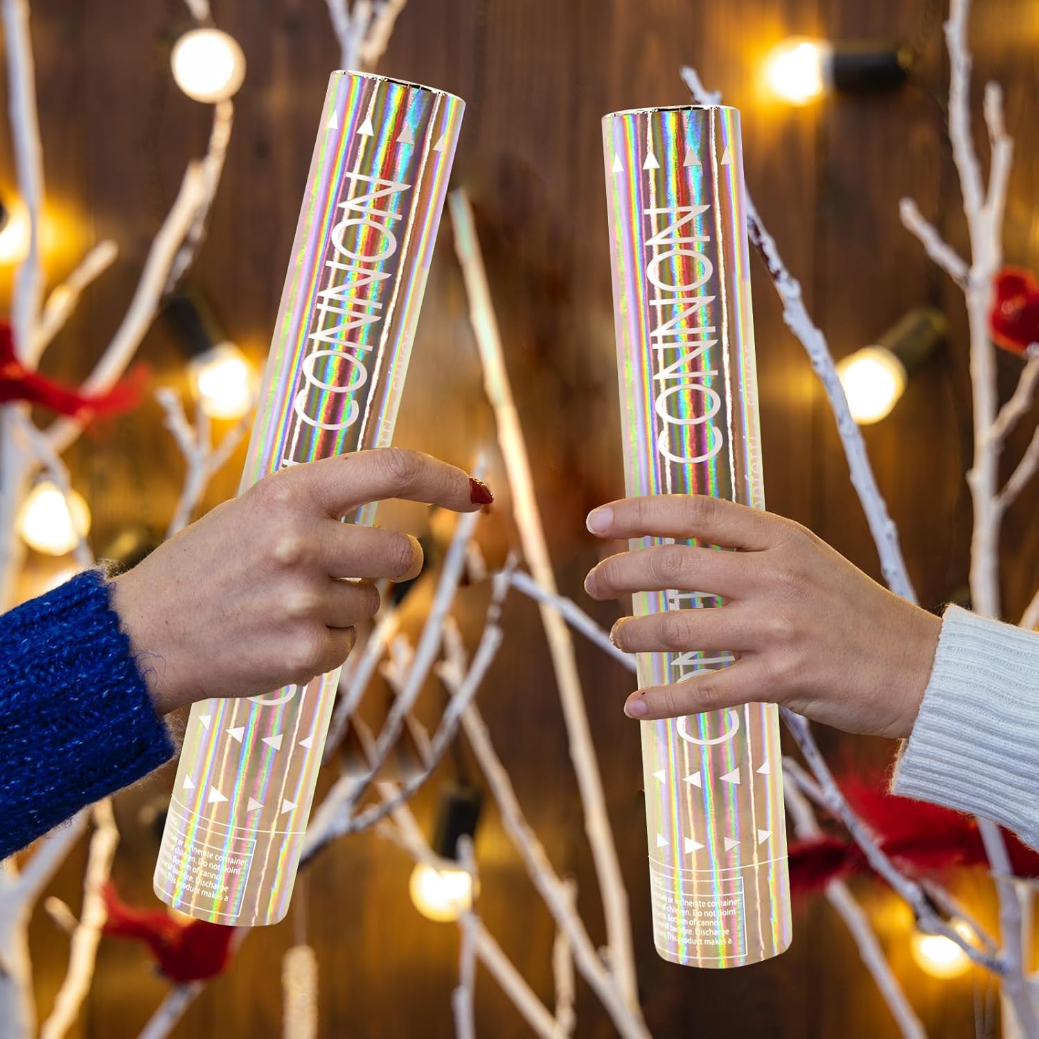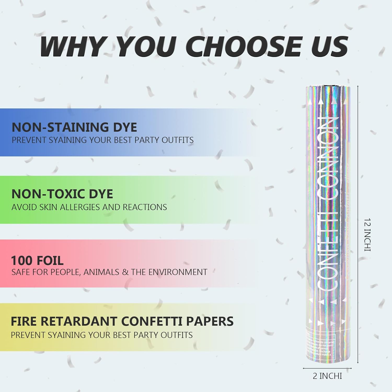 • CONFETTI CANNON FEATURES:Our confetti cannons come with a 12-pack of stunning silver poppers, each designed to unleash a beautiful shower of shiny silver confetti upon twisting. For an optimal experience, make sure to read the instructions carefully and peel off the packaging paper at the bottom of the popper