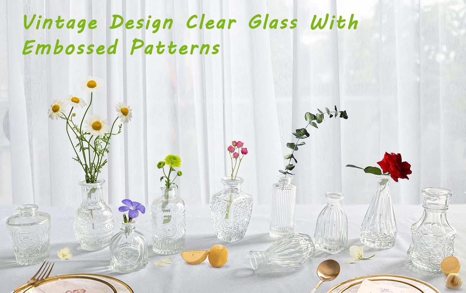 • 🌷VARIETY OF SHAPE: The surface of each glass vase is beautifully etched with a pattern.Each of these unique mini rustic vase comes with a different design, size, and shape. You can use them alone as a beautiful decorative piece, or you can add green plants and artificial flowers to create an atmosphere.