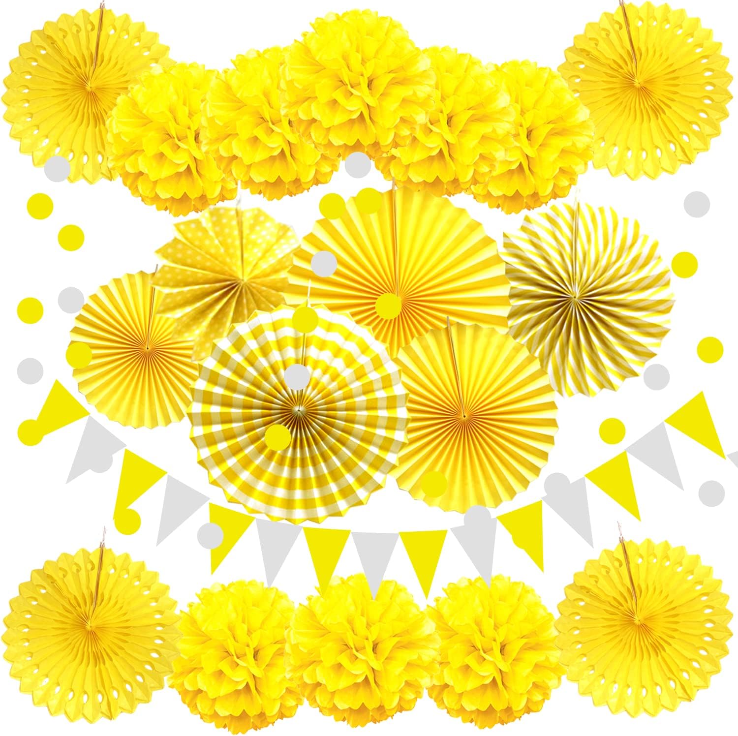 • Includes: 1 x 6.5ft Triangular pennants, 8 x 10inch/25cm Paper pompoms, 6 x 10inch/25cm Paper fans, 4 x Paper hollow fans, 2 x 6.5ft Circle Paper Garland. ( Color: Yellow and White)