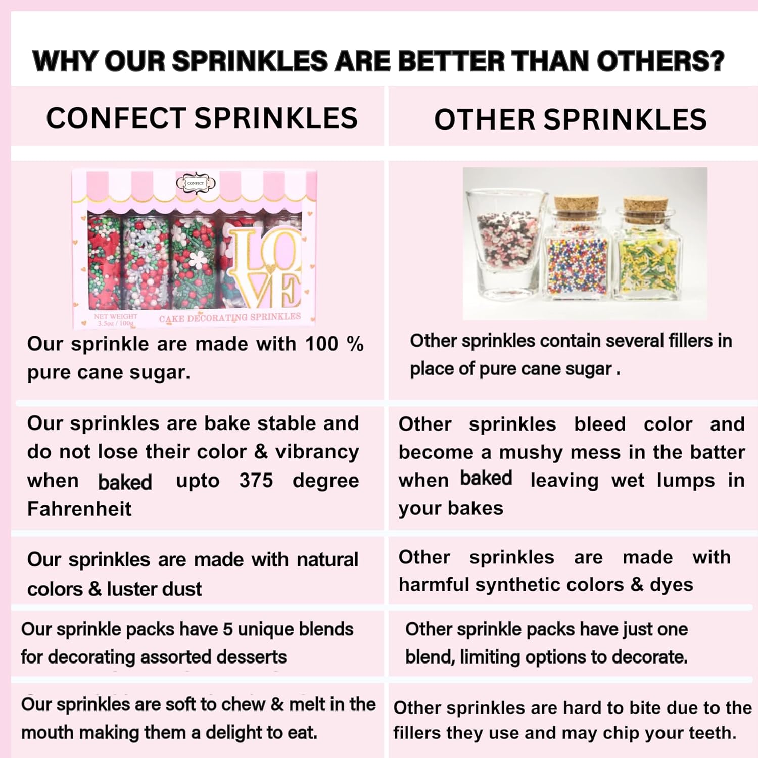 • Confect Sprinkles are made with the finest quality Ingredients & are soft to chew Sprinkles come in a unique pack of assorted colors and sizes.