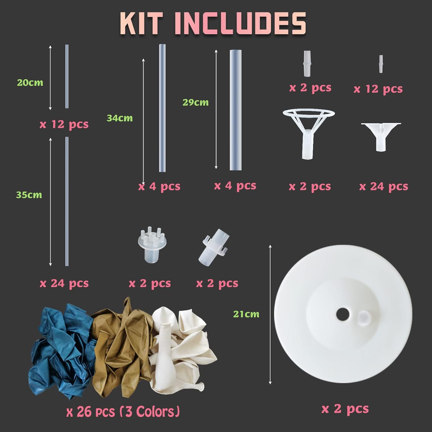 • 2 SETS BALLOONS STAND KIT INCLUDES - Kits Includes All The Necessary Component Parts for Two Balloon Columns, All in One Bag..Each Balloon Stand Comes in 2 Different Height Sizes.Perfect Size for Table & Ground.