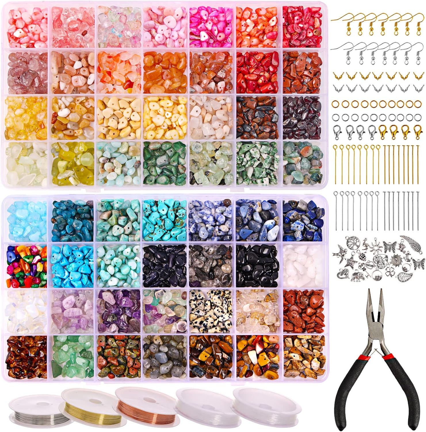 • All-in-one Jewelry Making Kit: Contains about 1500 crystals beads, 40 earring hooks, 40 head pins, 40 eye pins, 40 buckles, 100 jump rings, 10 lobster clasps, 30 silver pendants, 1 Jewelry pliers, 3 rolls of jewelry string, 2 rolls of elastic string.