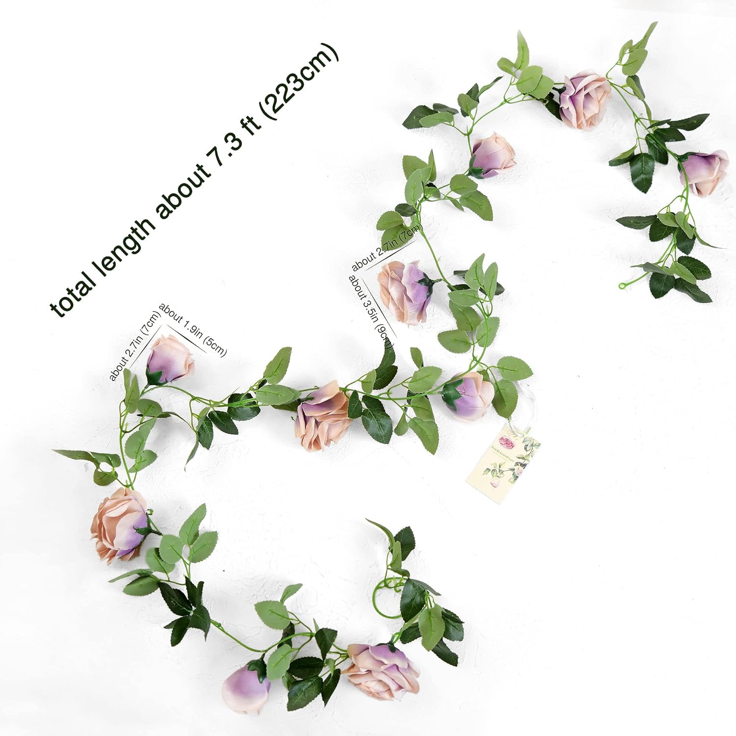 • From the moment the rose garlands are untangled, what makes our vines unique for decorating are the intricate connecting holes on each strand that can be used to attach to other leaf stems. As the bouquet unravels, large, richly layered rose petal heads are revealed along with vibrant, rich colors and realistic looking leaves.