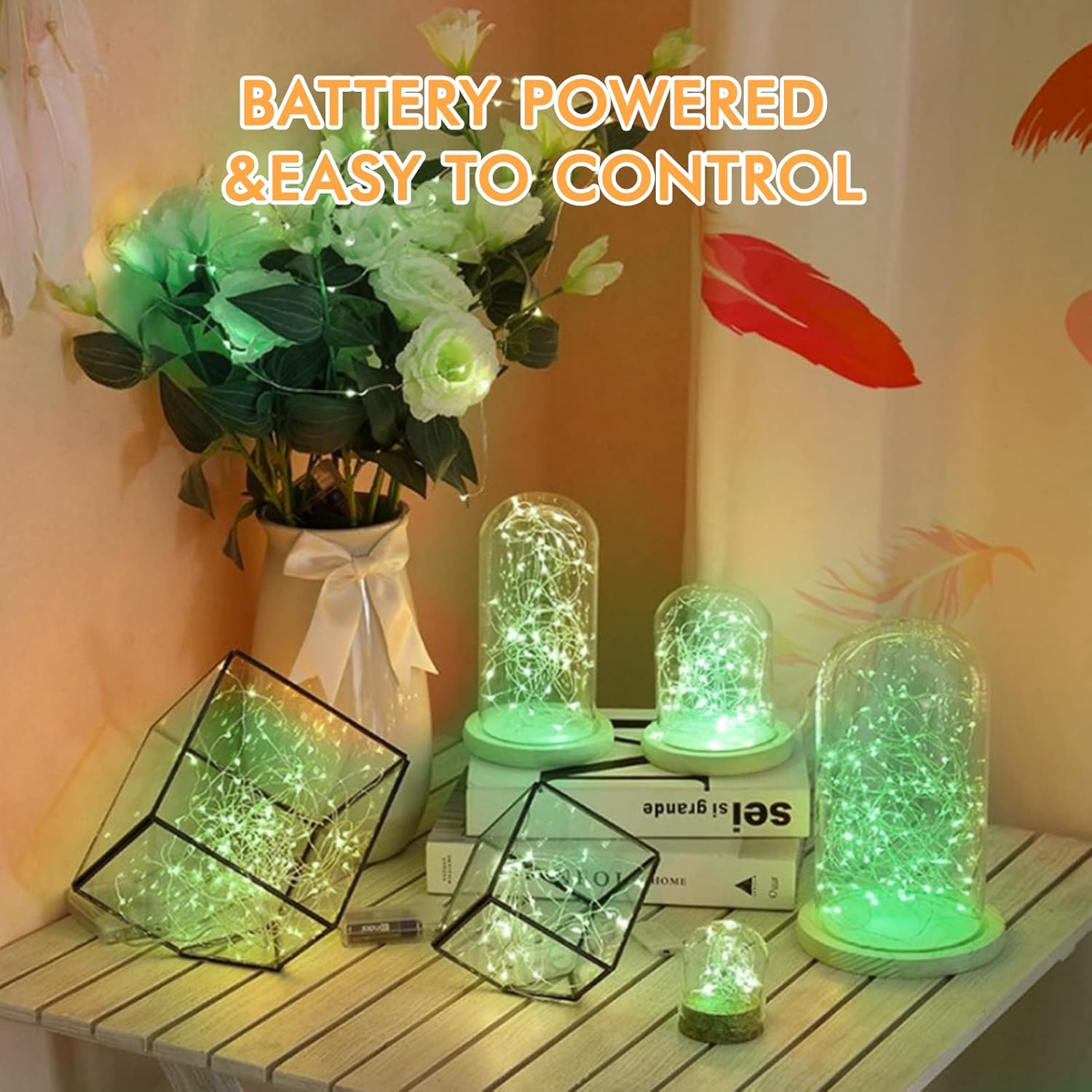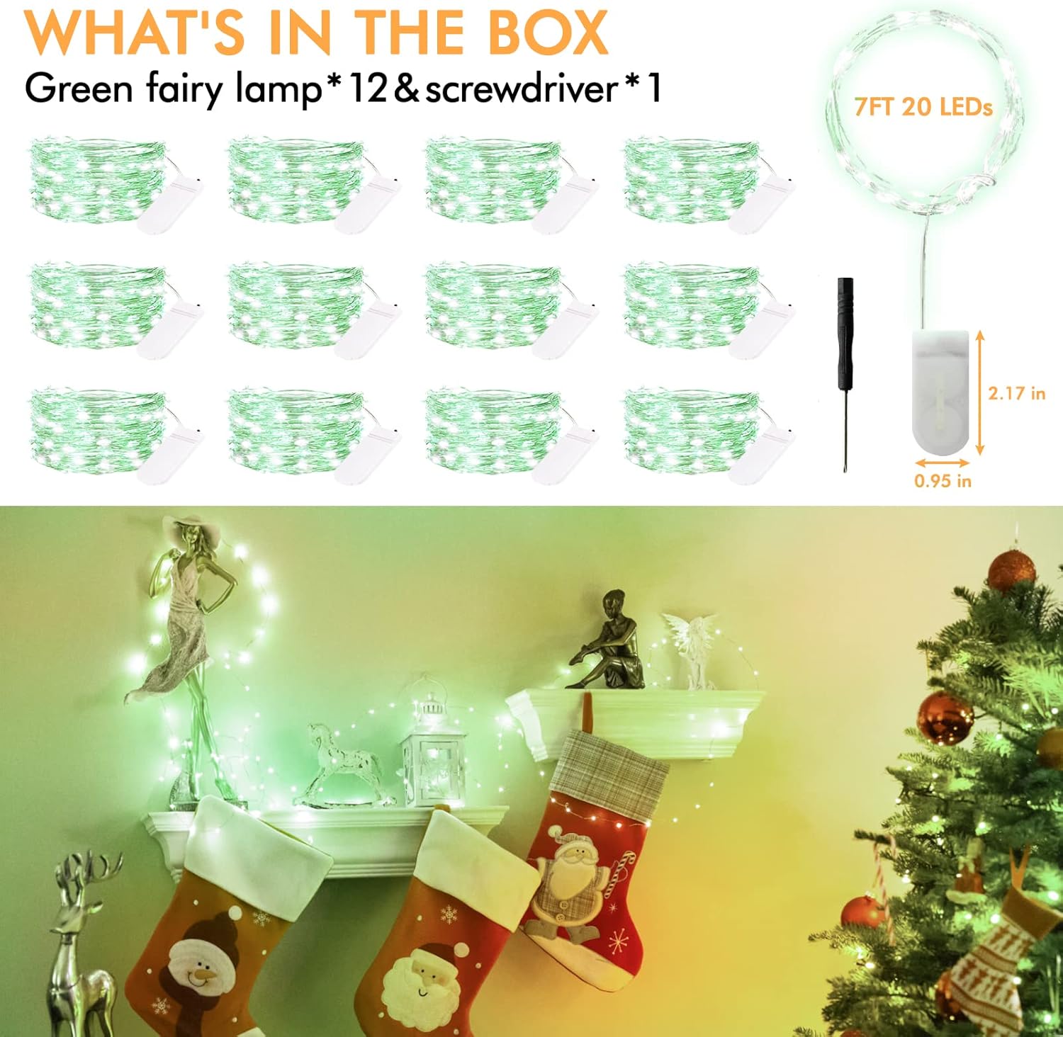 • ✨【12 Packs High-Quality Fairy Lights】 There are 12 packs of LED green fairy lights inside each box, Each string of fairy string lights is equipped with 20 super bright mini LDE lamp beads, The light flashes 360 degrees without glare and soft light to protect your eyes. The fairy lamp wire is 7ft long and made of soft copper wire. It can be bent into any shape you like or wrapped around anything you want to decorate. These fairy lights can make everything that is decorated by them dazzlin