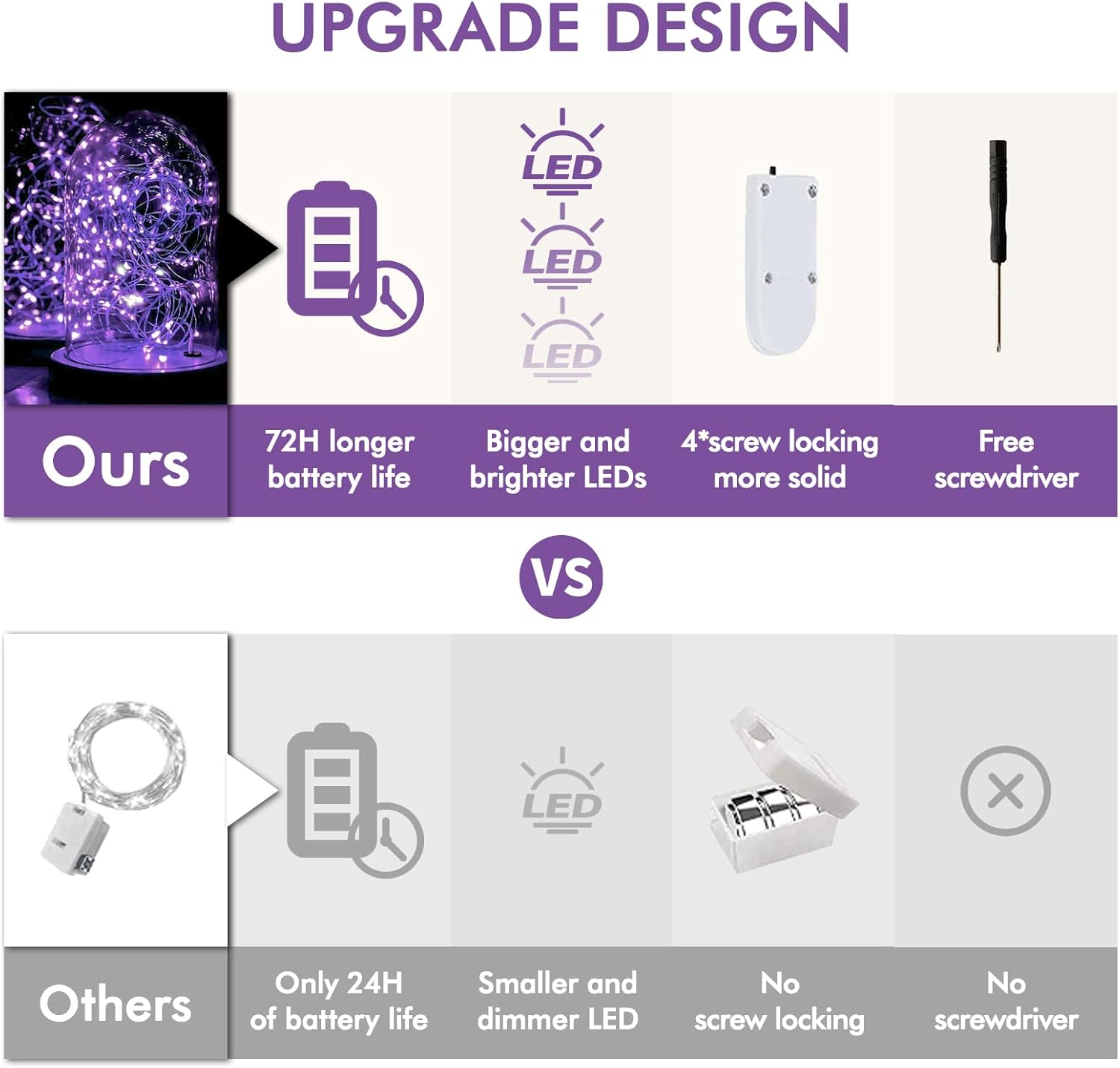 • ✨【12 Packs High-Quality Fairy Lights】 There are 12 packs of LED purple fairy lights inside each box, Each string of fairy string lights is equipped with 20 super bright mini LDE lamp beads, The light flashes 360 degrees without glare and soft light to protect your eyes. The fairy lamp wire is 7ft long and made of soft copper wire. It can be bent into any shape you like or wrapped around anything you want to decorate. These fairy lights can make everything that is decorated by them dazzlin