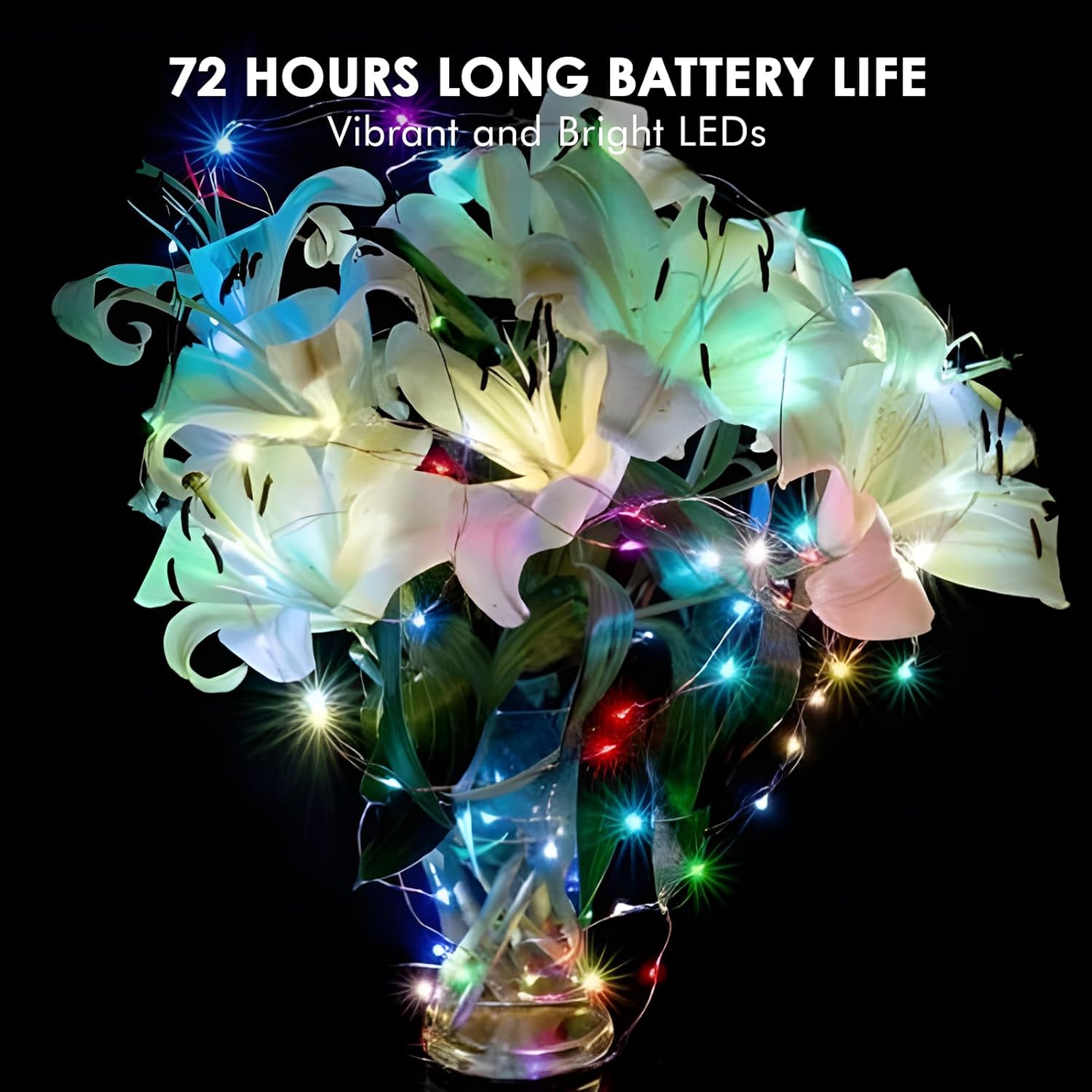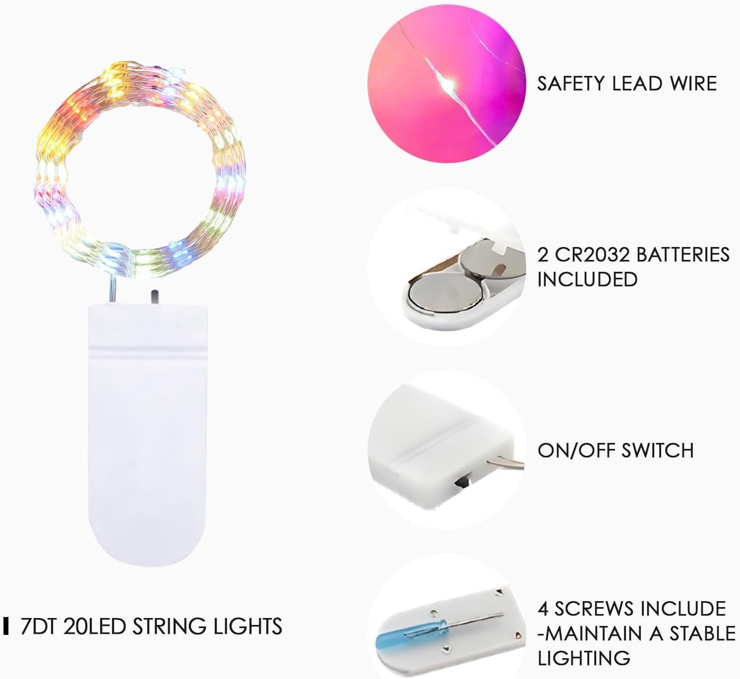 • ✨【12 Packs High-Quality Fairy Lights】 There are 12 packs of LED Coloured fairy lights inside each box, Each string of fairy string lights is equipped with 20 super bright mini LDE lamp beads, The light flashes 360 degrees without glare and soft light to protect your eyes. The fairy lamp wire is 7ft long and made of soft copper wire. It can be bent into any shape you like or wrapped around anything you want to decorate. These fairy lights can make everything that is decorated by them dazzlin