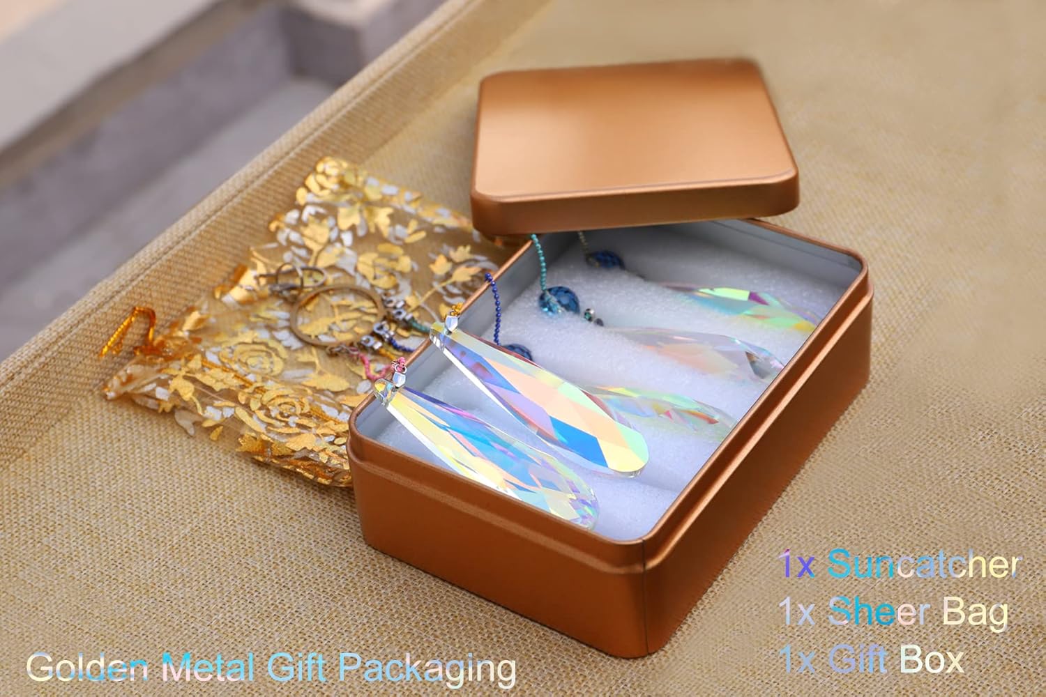 • SPECIFICATION: Color AB Premium Quality Teardrop Prismatic Crystal Pendants 73mm(2.9")x20mm(0.79") + Colors Rainbow Copper Chains + Stainless Steel Hook + Other accessories are stainless steel. This suncatcher is made of high quality crystal glass, copper and stainless steel materials, can keep shining year by year whether indoor or outdoor, in the wind and rain or sun