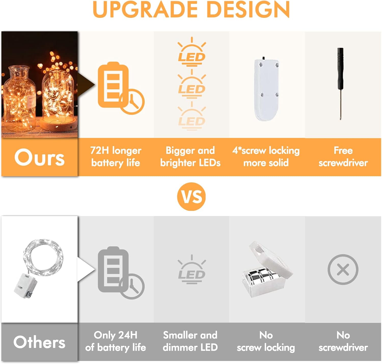 • ✨ 【Long battery life】The battery-powered fairy light battery case contains 2*CR2032 battery. The battery life is up to 72 hours, which is longer than the 24 hours of other fairy string lights. We have a screwdriver for every box of fairy lamps. When the light of your LED fairy lights becomes weak, you only need to buy new batteries and change them with a screwdriver to use them again. The operation is easy and simple