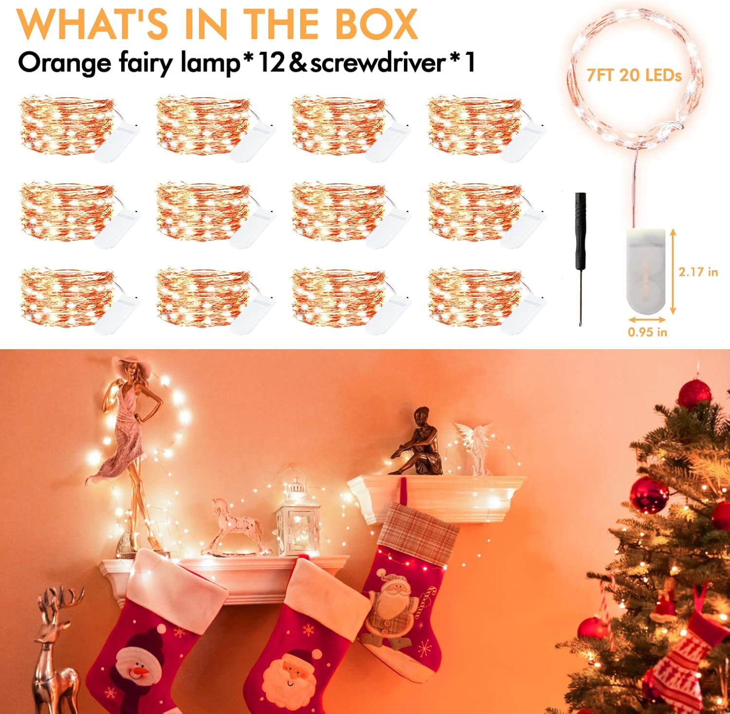 • ✨【12 Packs High-Quality Fairy Lights】 There are 12 packs of LED orange fairy lights inside each box, Each string of fairy string lights is equipped with 20 super bright mini LDE lamp beads, The light flashes 360 degrees without glare and soft light to protect your eyes. The fairy lamp wire is 7ft long and made of soft copper wire. It can be bent into any shape you like or wrapped around anything you want to decorate. These fairy lights can make everything that is decorated by them dazzling