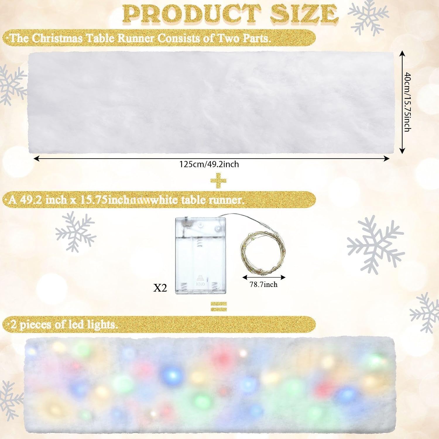 • Detailed Product Size: each lighted snow table runner is approx. 40 x 125 cm/ 15.75 x 49.21 inches, approx. 2 cm/ 0.79 inches in thickness; The length of LED light string is about 2 meter/ 6.56 ft, enough for you to create a warm Christmas scene; These snow blankets can be cut, and you can adjust them according to your actual needs