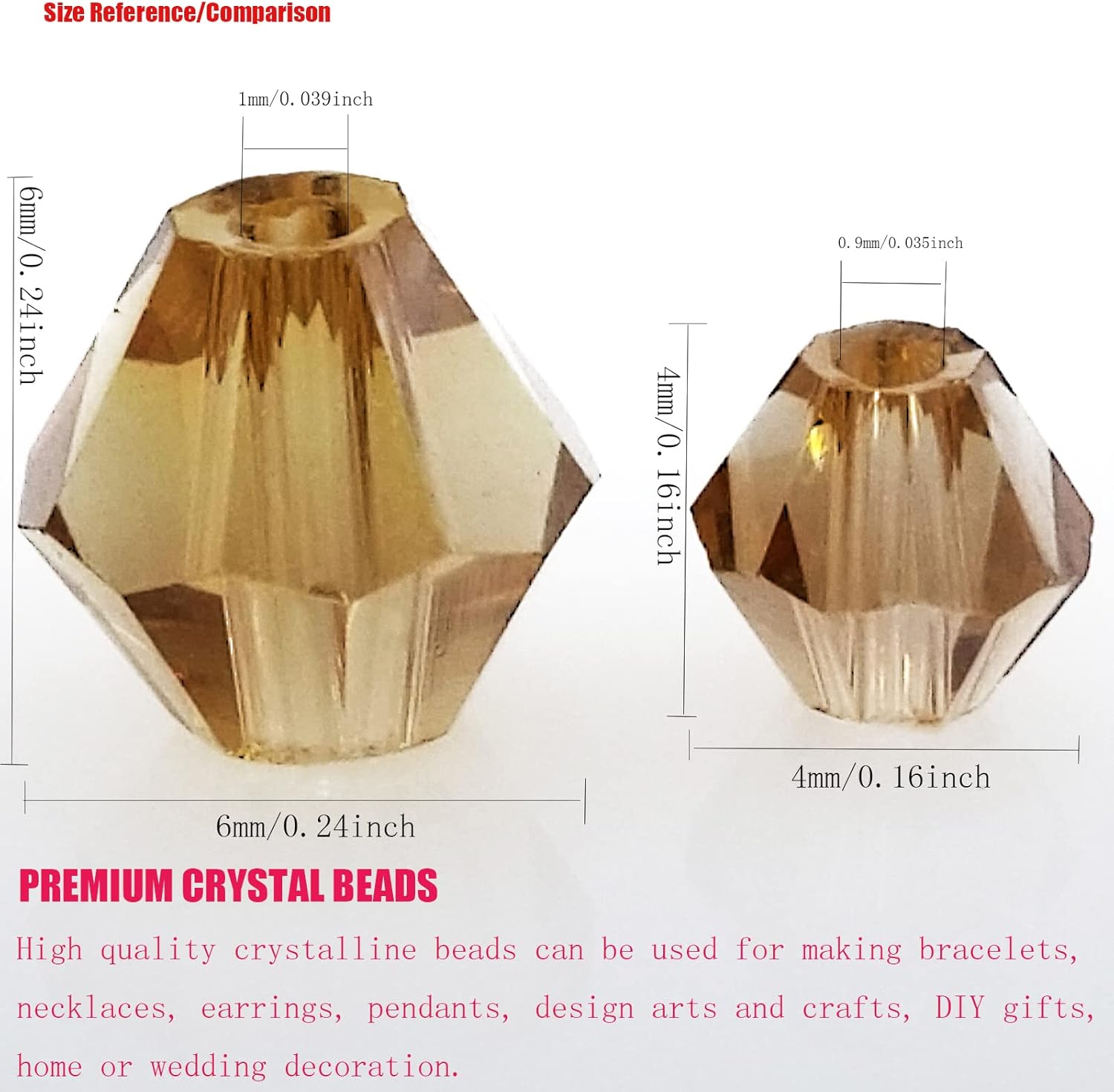 • 【PACKAGING and SIZE】 Package includes 1800Pcs 4mm Bicone faceted crystal glass beads in gold champagne AB color.Bead size: 4mm (or ~ 0.16 inch); Hole diameter ~ 0.9mm ( ~ 0.035 inch).In addition, we provide you with some stretchy cord and add an organza bag.Let your family and friends enjoy DIY happy time together.Kindly note: Please make sure this small bead size meets your needs before placing an order,thank you.