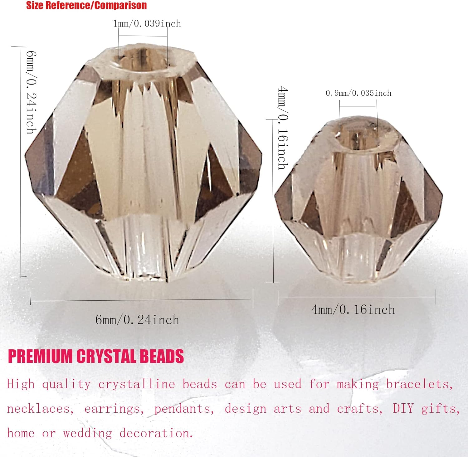 • 【PACKAGING and SIZE】 Package includes 450Pcs 6mm Bicone faceted crystal glass beads in silver champagne AB color. Bead size: 6mm (or ~ 0.24 inch); Hole diameter ~ 1mm ( ~ 0.039 inch).In addition, we provide you with some stretchy cord and add an organza bag.Let your family and friends enjoy DIY happy time together.Kindly note: Please make sure this bead size meets your needs before placing an order,thank you.