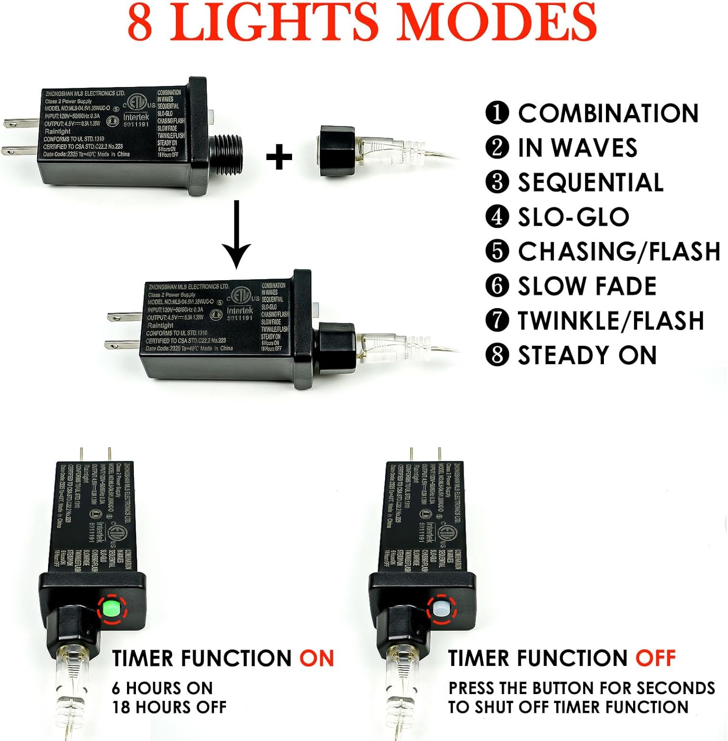 • Convenient Timer Function & 8 Modes & Memory Function: The button is at the end of the plug to turn on/off the timer function, press the button for few seconds till the green light on/off to turn on/off the timer function and switch 8 modes (combination, in waves, sequential, slo glo, chasing/flash, slow fade, twinkle/flash, steady on). This fairy lights could remember the setting of previous night you set.