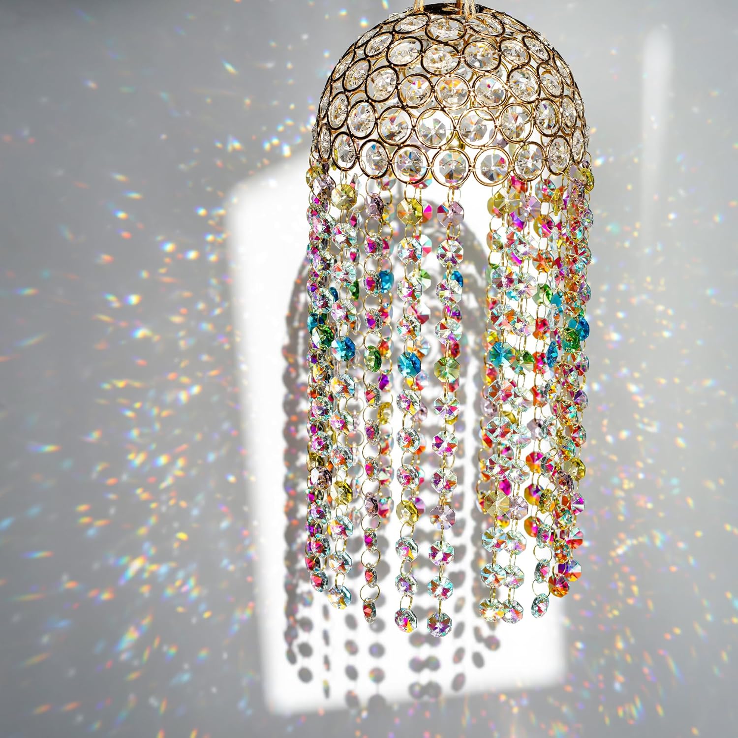 • High Quality Material: Crystal wind chimes pendant are made with premium quality k9 crystal, The colorful decorative wind chime is composed of K9 crystal beads prisms, and that’s why the make rainbow sparkling light reflections.Size:12*5.9 in;Nw:560 g/pcs