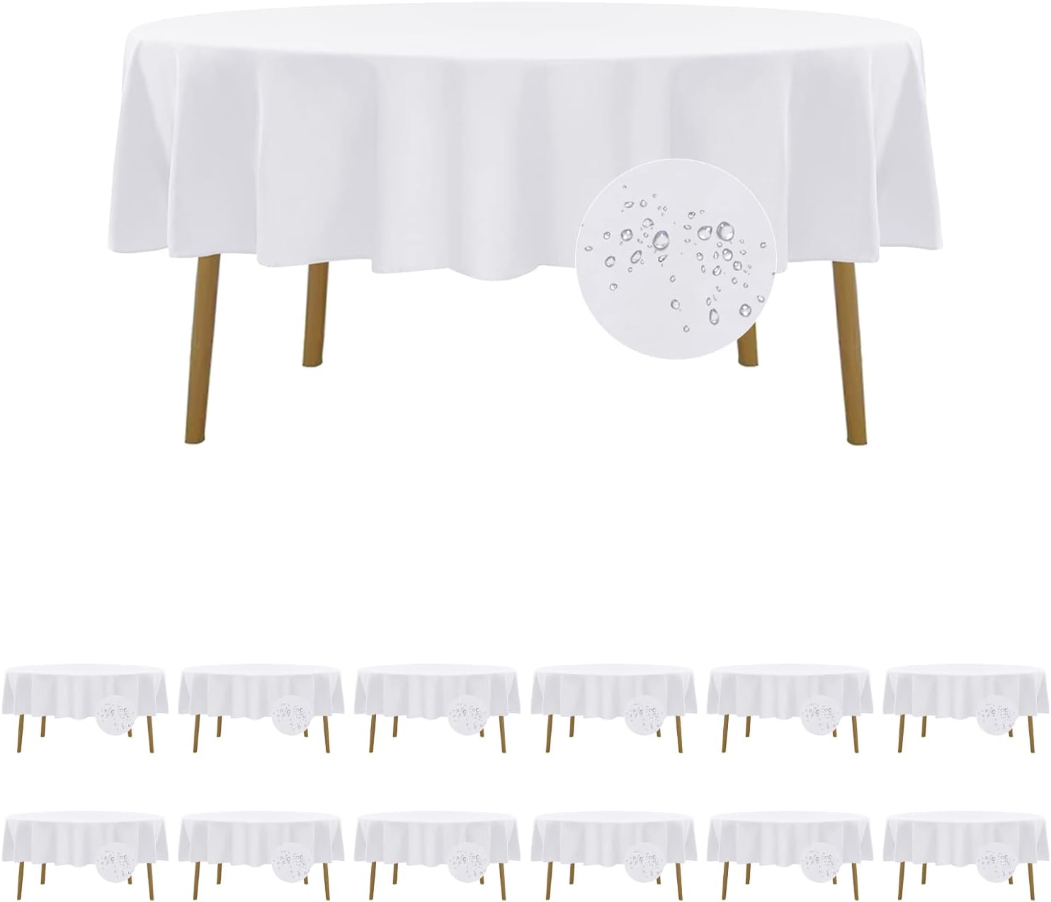 Fokitut 12 Pack Waterproof Round Tablecloth, 70 Inch, Stain Resistant and Wrinkle Polyester Table Cloth, Fabric Table Cover for Kitchen Dining, Wedding, Party, Holiday Dinner-White