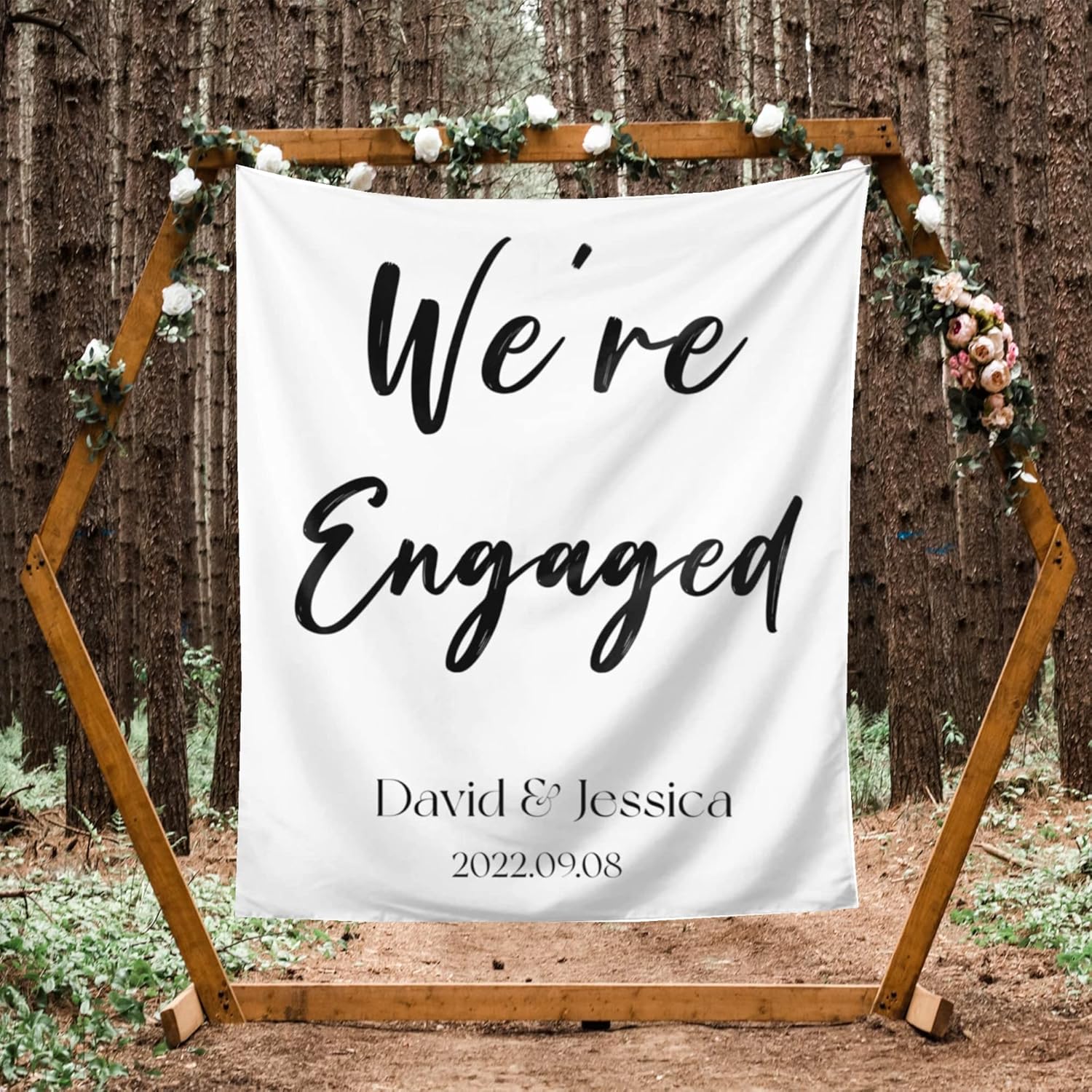 We're Engaged Backdrop, Custom Tapestry with Names and Date, Personalized Calligraphy Wedding Banner for Ceremony, Engagement Backdrop, Rustic Wedding Sign, Reception Backdrop, Engagement Party Decor