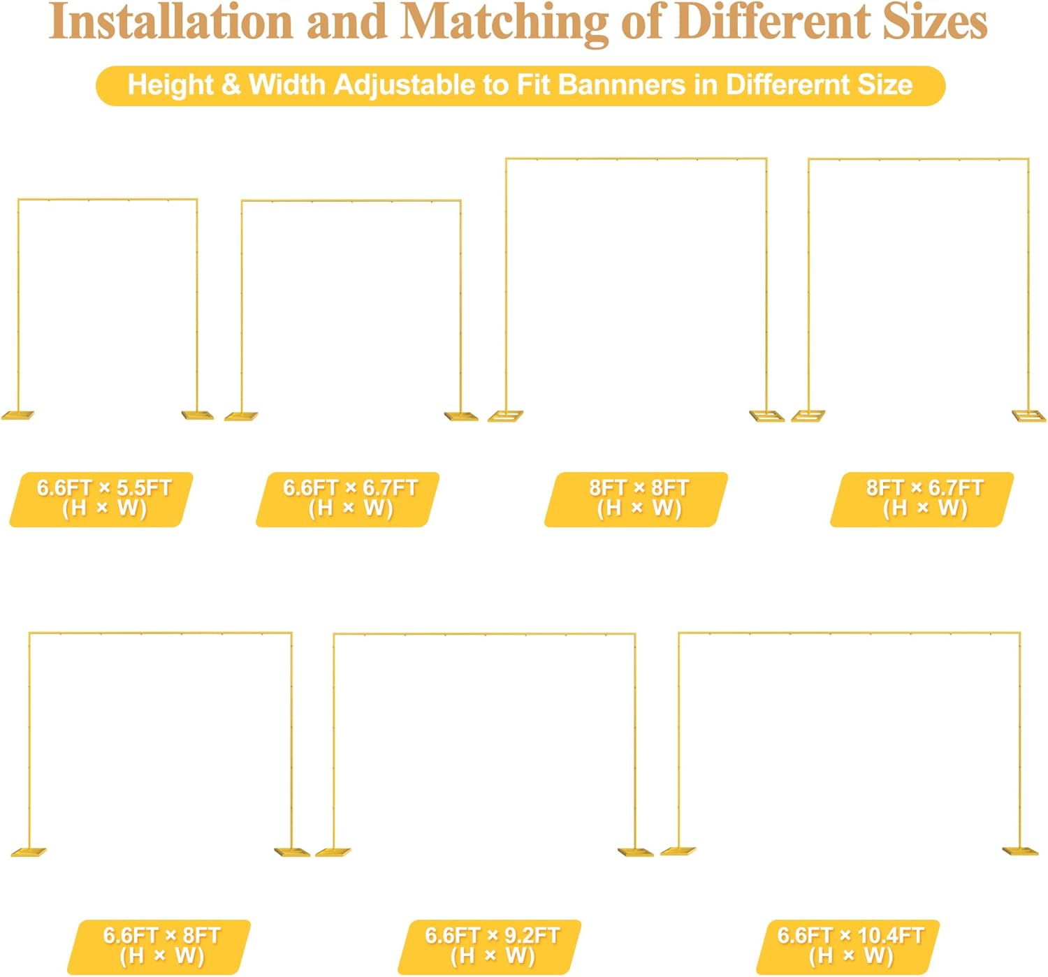 • 【Application】Heavy duty pipe and drape backdrop stand is an ideal choose for weddings, receptions, parties, birthdays, bridal and baby showers, photography, photo booths, banner stand backdrop, business events, etc. Square gold balloon arch stand would be a great scenery at your event!