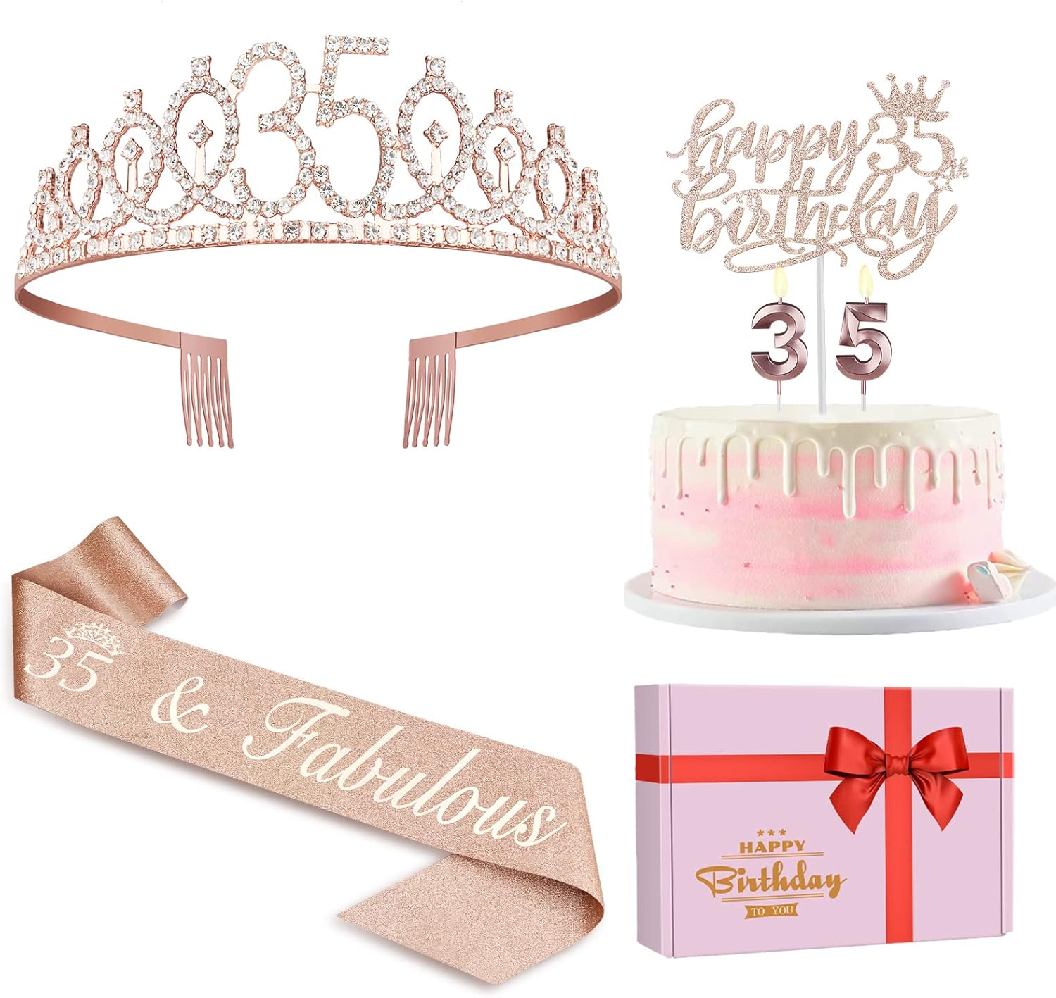 • 35 Birthday Decorations for Women: Birthday Sash for Women *1pc,Women Birthday Crown*1pc, Happy 35th Birthday Cake Topper *1pc, 3+5 Numeral Candles *1set.