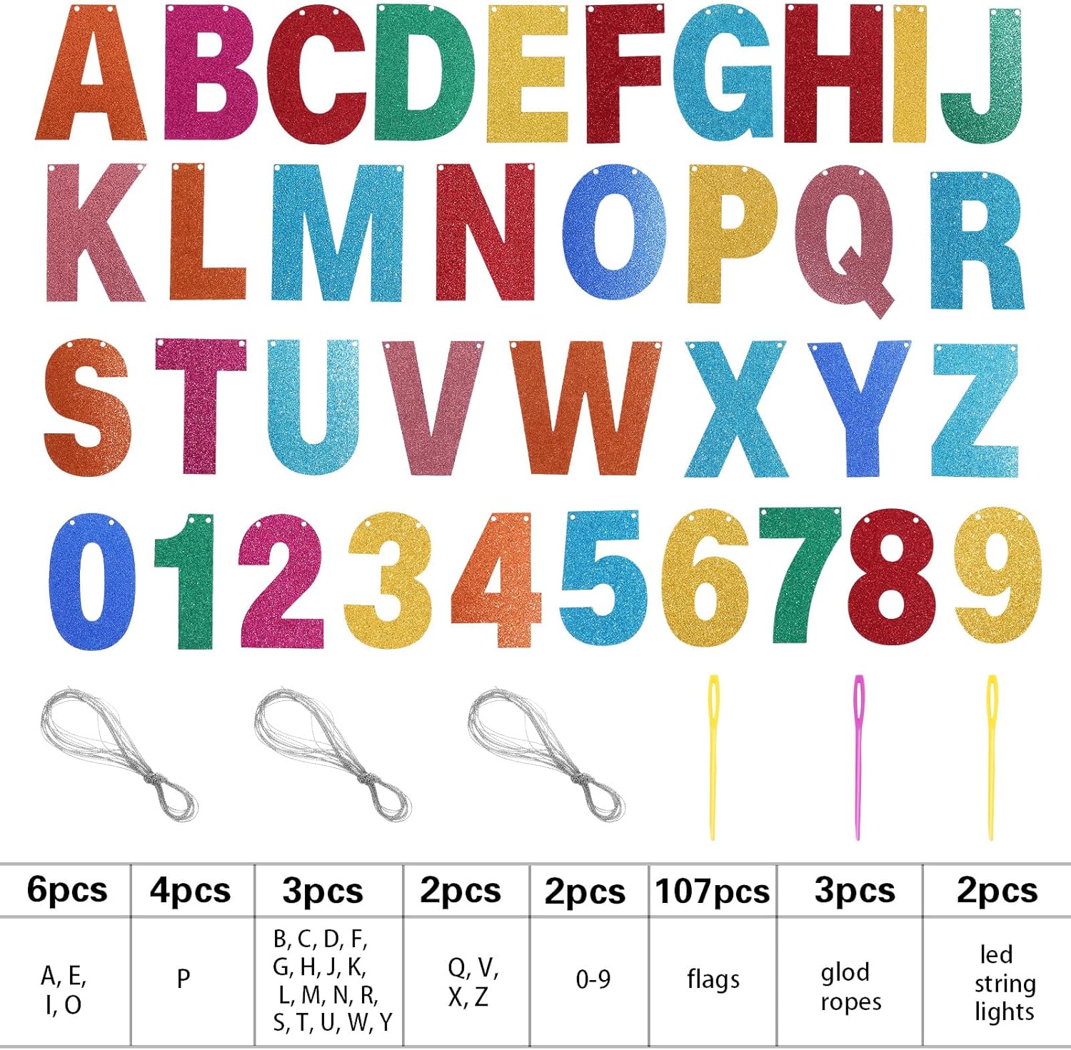 • DIY Banner Kit with Letters: you will get 107 pieces of letters and numbers, including 6 'A, E, I, O' letters, 4 'P' letters, 3 'B, C, D, G, H, J, K, L, letter M, N, R, S, T, U, letter W, Y, F shape' letters, 2 'Q, V, X, Z' letters and 2 '0-9' numbers, come with 3 ropes; Nice combination meet your various parties decorative demands