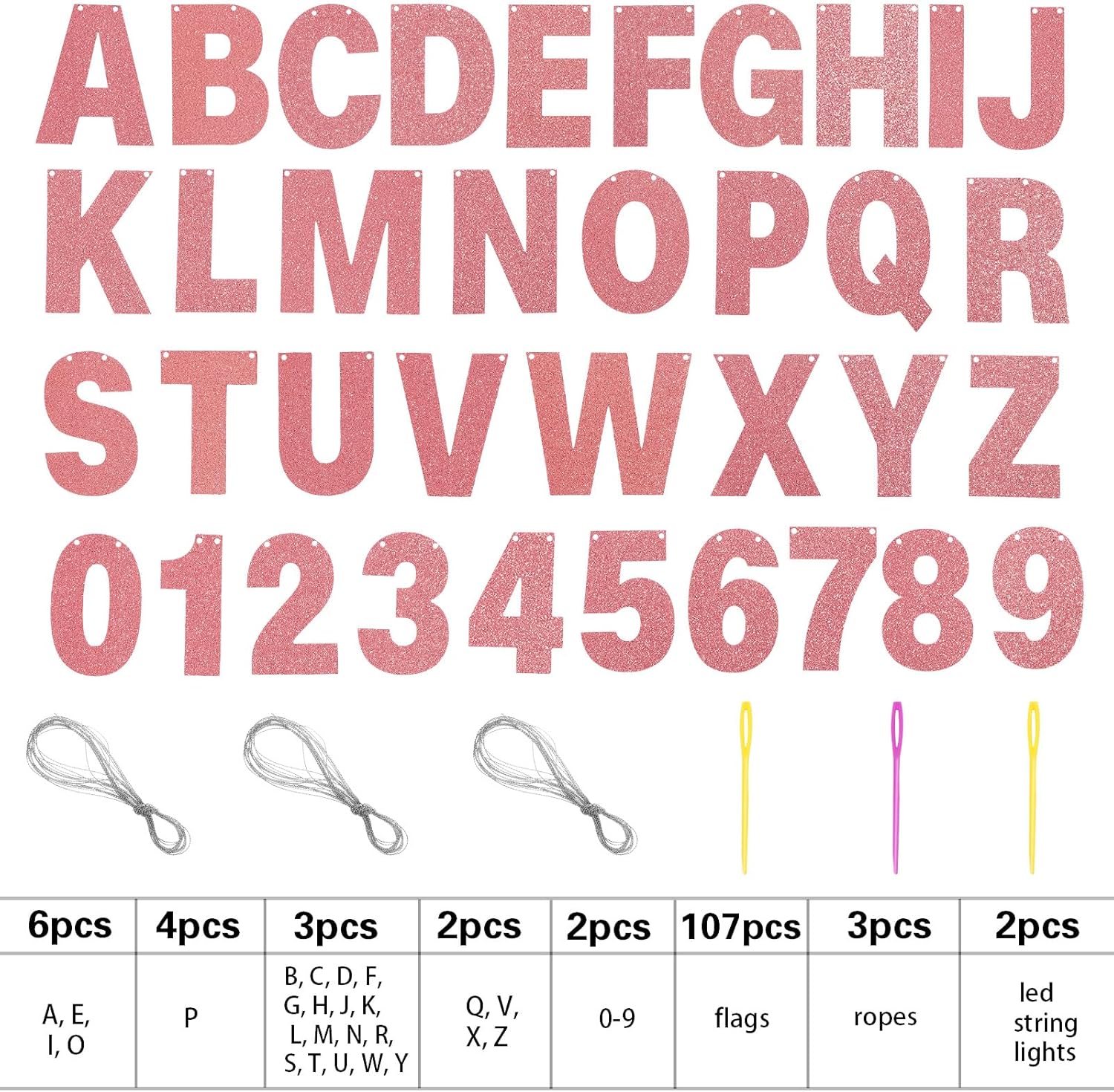 TaoBary 112 Pcs DIY Letter Custom Banner Glitter Customizable Banner Kit Including 107 Letters and Numbers 3 Rope for Valentine Birthday Party(Rose Gold)