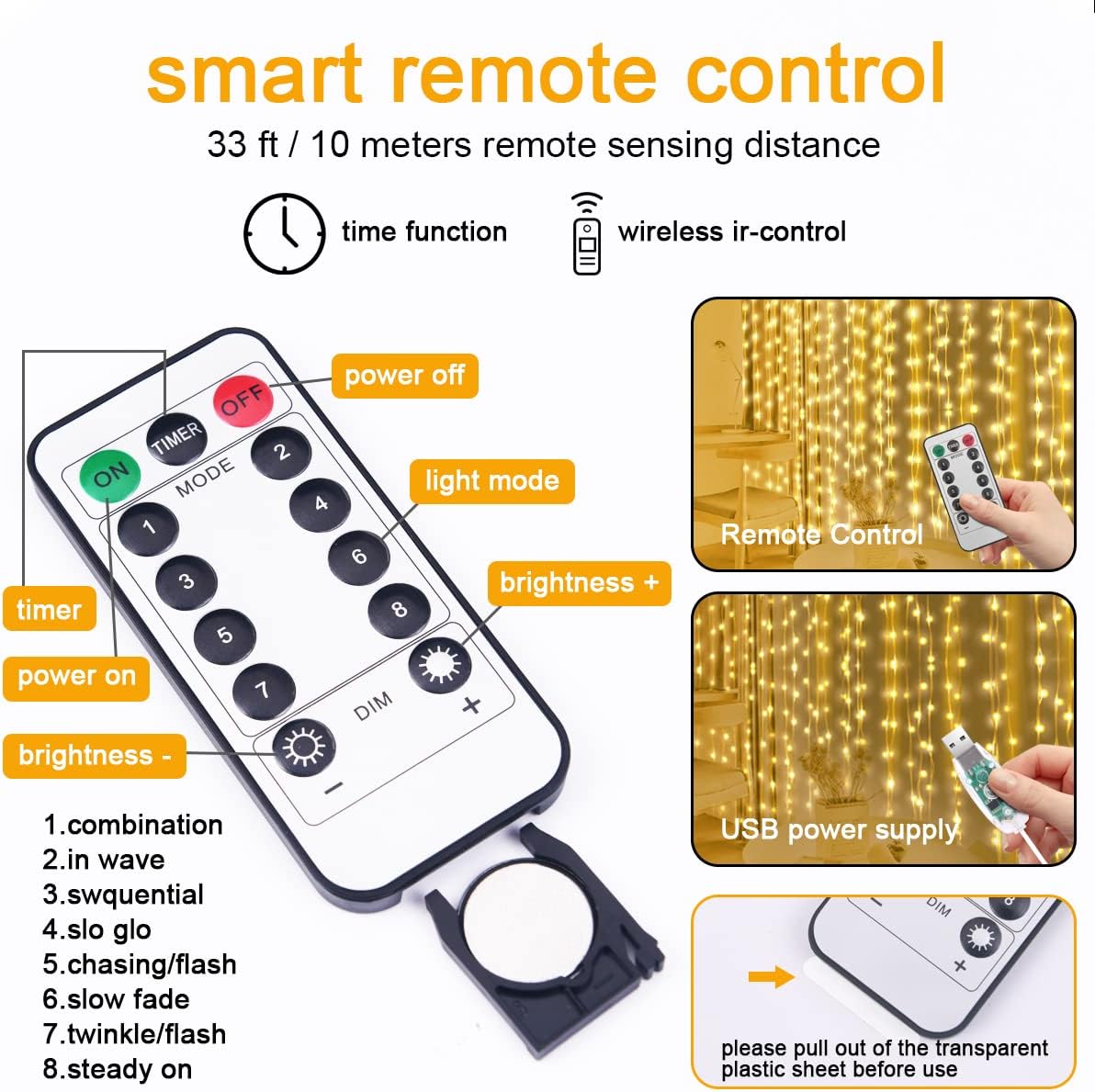 • 🌟【High Quality 300 LED Curtain Lights】The curtain lights measure 9.8 feet x 9.8 feet, these fairy string curtain lights are made of copper wire and contain 300 ultra-bright LEDs. It is completely sealed, very safe, soft and strong, the curtain light can be cut freely without affecting the rest of the light, so you can DIY any decoration you like.