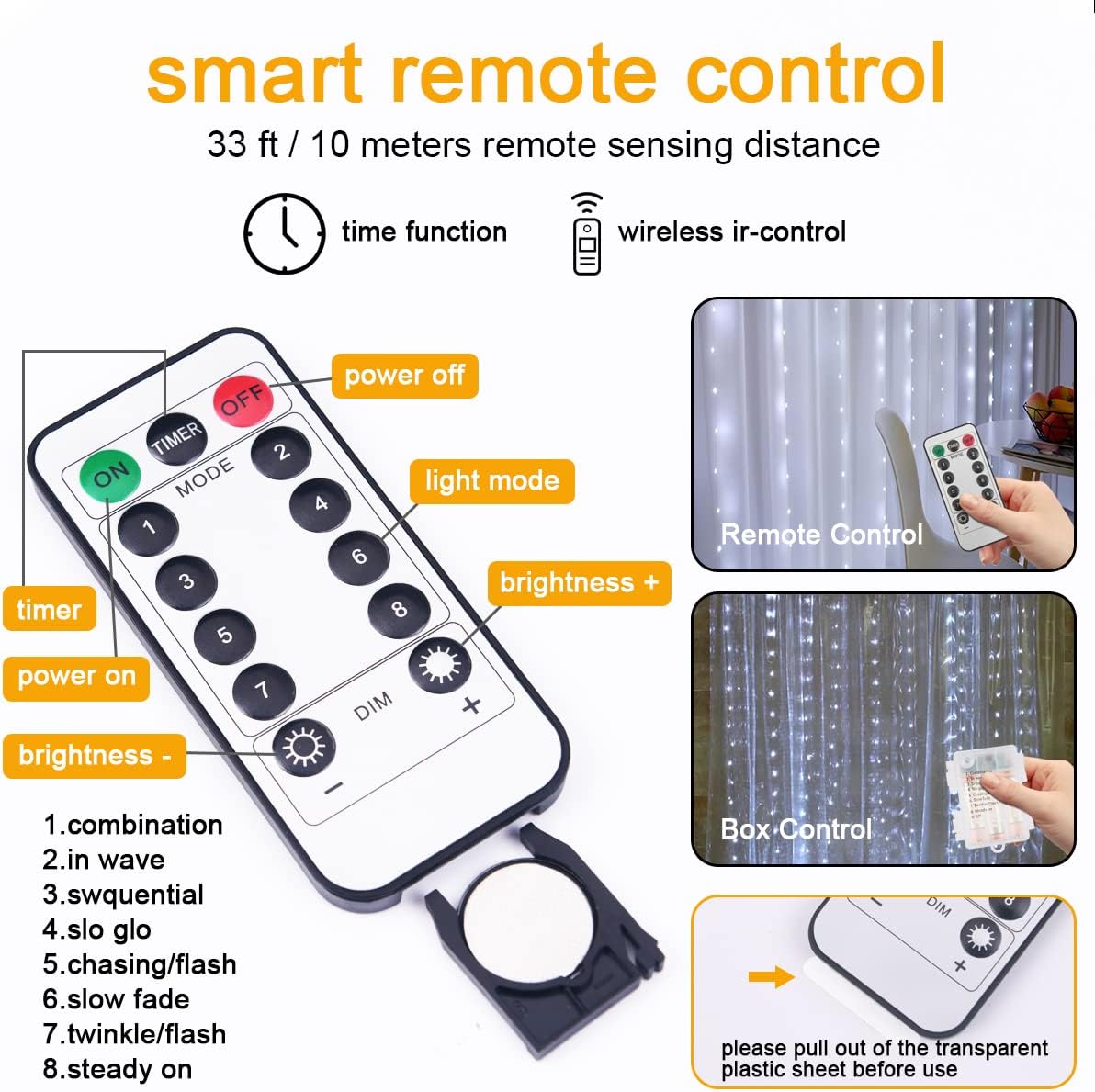 • 💡【High Quality 300 LED Curtain Lights】The curtain lights measure 9.8 feet x 9.8 feet, these fairy string curtain lights are made of copper wire and contain 300 ultra-bright LEDs. It is completely sealed, very safe, soft and strong, the curtain light can be cut freely without affecting the rest of the light, so you can DIY any decoration you like.