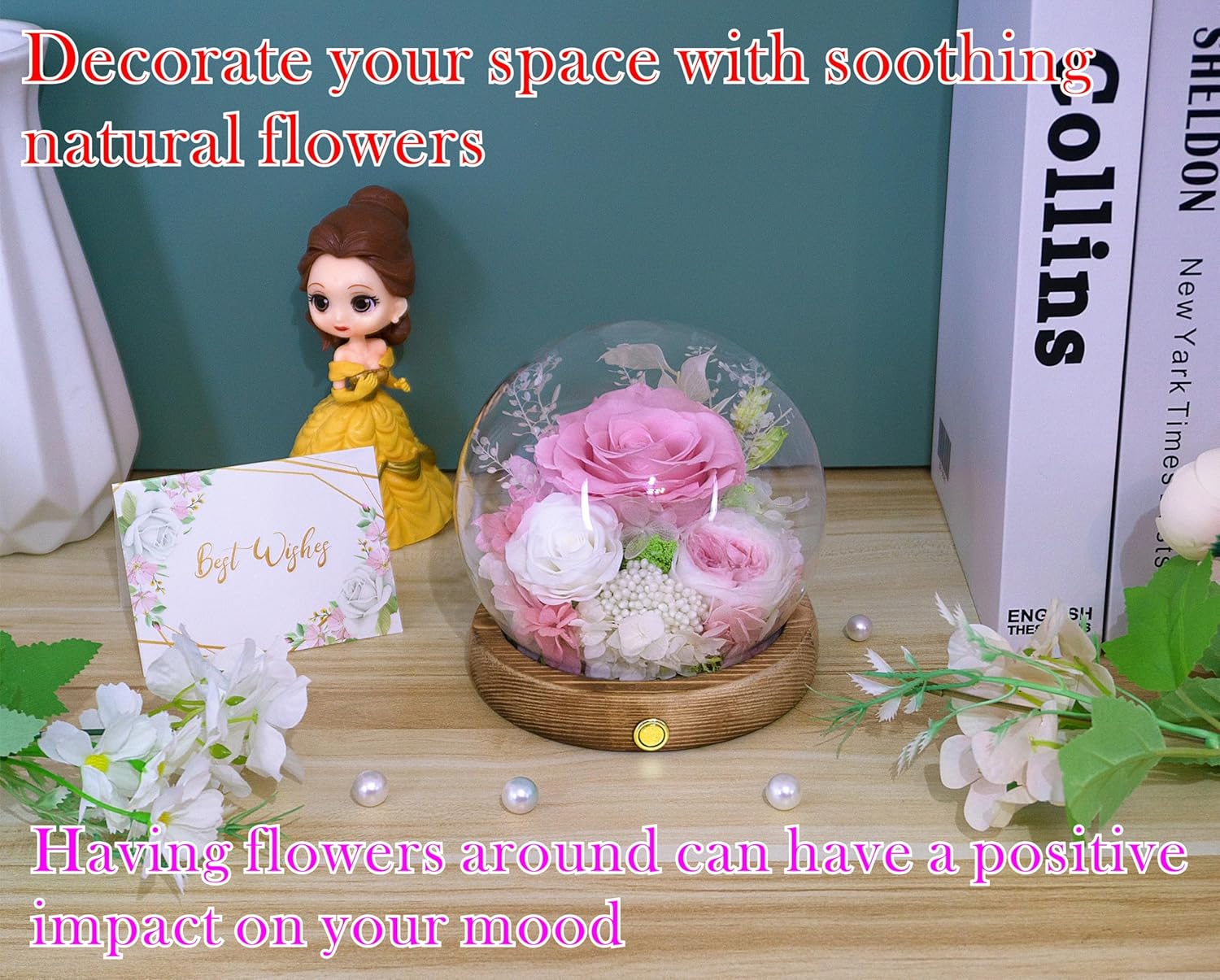 • ♥Please note♥:1. Due to the delicateness of natural flowers, opening the glass dome is not recommended as it can lead to unintended damage to the flowers. 2. Since these are real flowers crafted by hand and not mass-produced by machine, there may be slight variations in certain cases. 3. loose and incorrect battery insert will result in lights not turning on. If that's the case, simply remove the batteries and reinsert them correctly. 4. We've recently made new improvements to our products for you. For more details, simply go to the bottom of this page.
