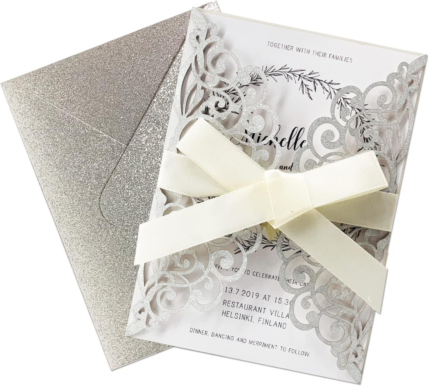 50Pcs Laser Cut Wedding Invitation With Glitter Envelopes And Ribbons Blank Personalized Card Invitaciones Para quinceañera Birthday Baby Shower Christmas Party Bridal Shower (Silver)