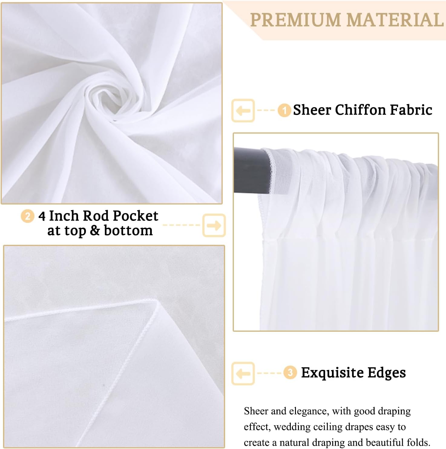 • ⭐Quality Material - Chiffon Drapery Curtains: The material of ceiling curtain is premium sheer chiffon fabric, silky soft and wrinkle-free, sturdy and reusable. More graceful than other nylon fabrics. All edges of chiffon drapes for wedding are finished with with nice stitching. The party ceiling drapes is a good choice for party decoations, giving your events an elegant and romantic look.