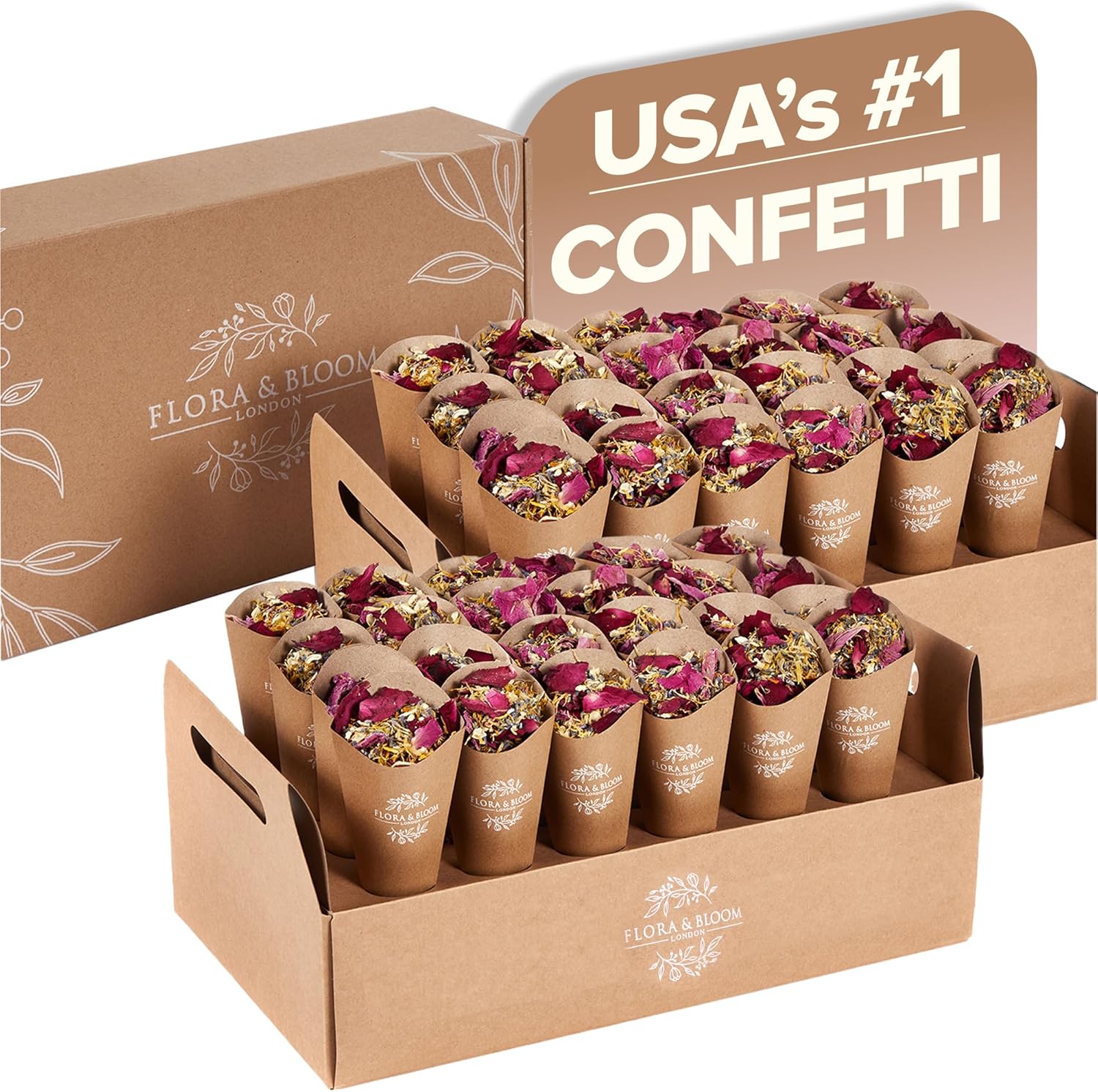 • COMPLETE WEDDING CONFETTI KIT - 3 liters of dried petals with cone tray and 48 pre-constructed cones. Plenty for 48 guests and extra for table decoration.