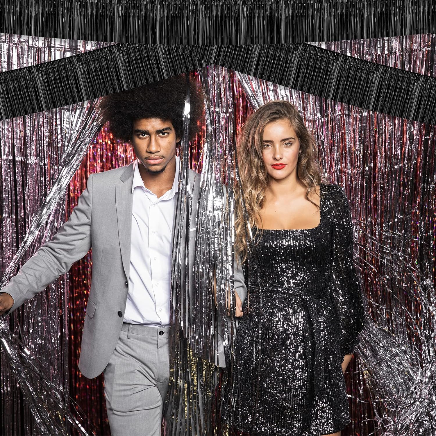 10 Pack 10 Feet Foil Fringe Garland Metallic Tinsel Streamers Banner Wall Hanging Curtain Backdrop for Parade Floats, Bachelorette, Wedding, Birthday, Halloween, Christmas Party Decorations(Black)