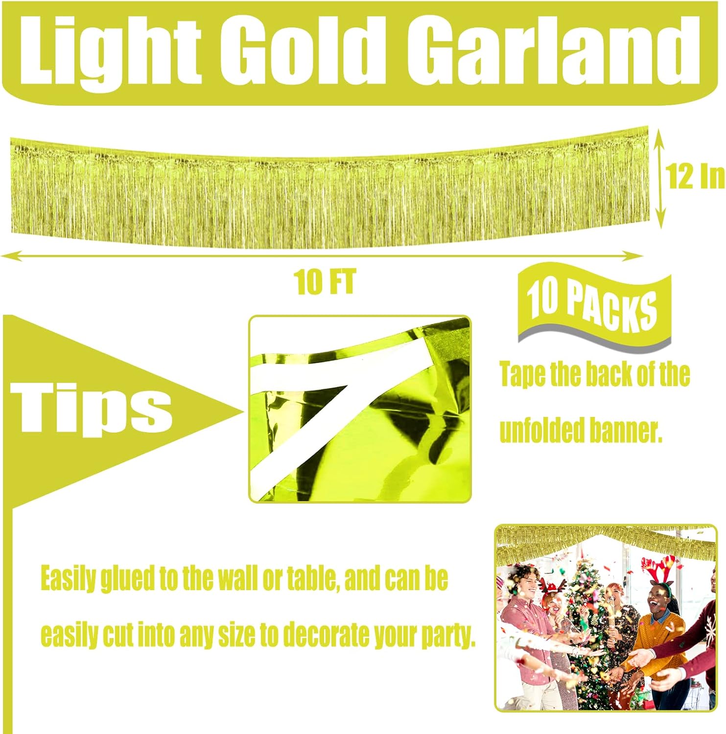 10 Pack 10 Feet Foil Fringe Garland Metallic Tinsel Streamers Banner Wall Hanging Curtain Backdrop for Parade Floats, Wedding, Disco, Birthday, Halloween, Christmas Party Decorations(Light Gold)