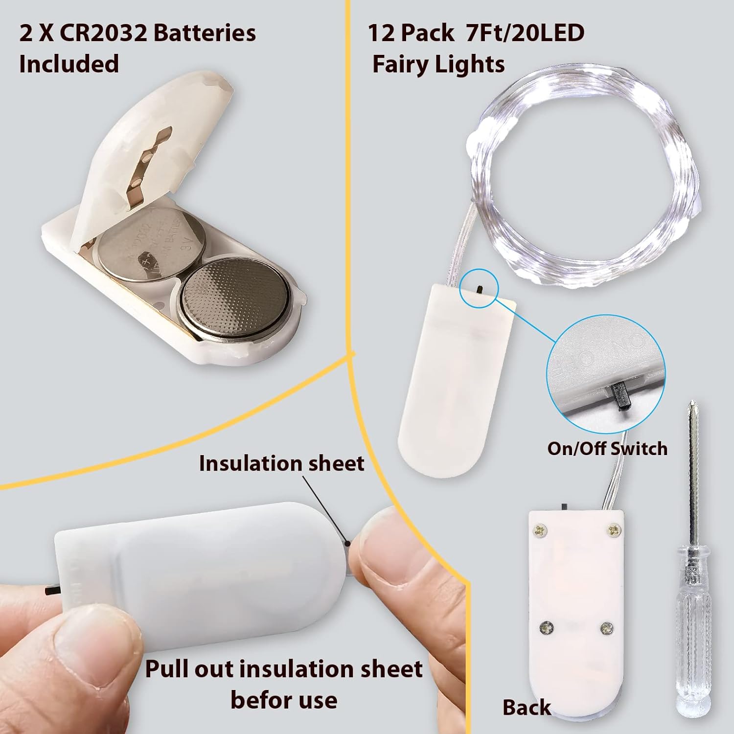 • 【Fantastic White Lights】: 12 separate mini fairy lights battery powered, made of 7ft high quality Silver coated copper wire, It’s flexible, strong and durable. Perfect for your crafts project , floral arrangements plants, signs, furniture glass jars, vases, wine bottles or other decorations.