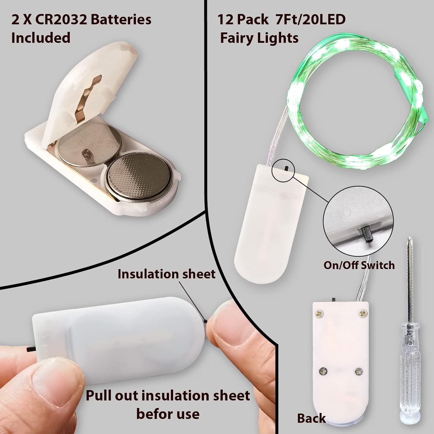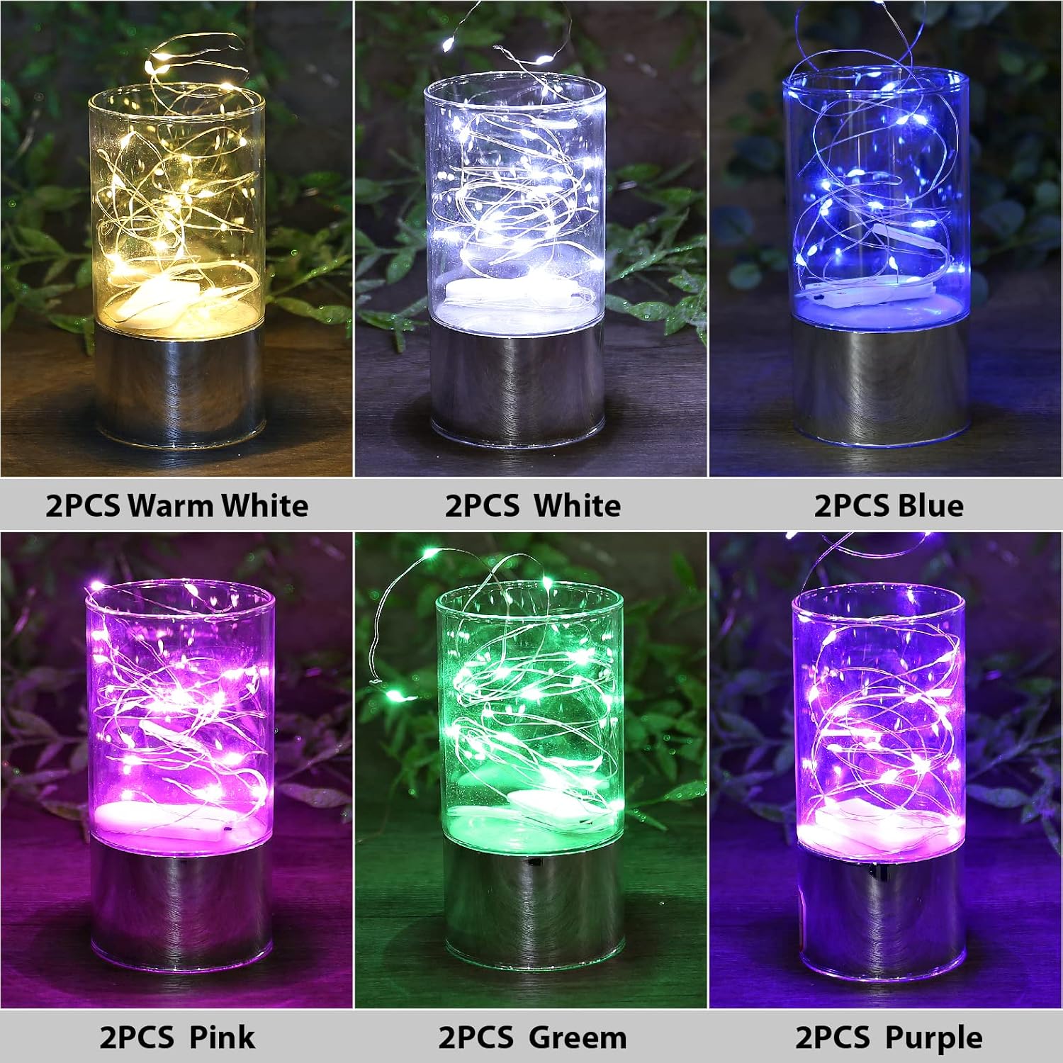 • 【Fantastic Multicolor Lights】: 12 separate mini fairy lights battery powered, Total included 2 x warm white, 2 x white, 2 x blue ,2 x green, 2 x pink , 2 x purple. Made of 7ft high quality Silver coated copper wire, It’s flexible, strong and durable. Perfect for your crafts project , floral arrangements plants, signs, furniture glass jars, vases, wine bottles or other decorations.