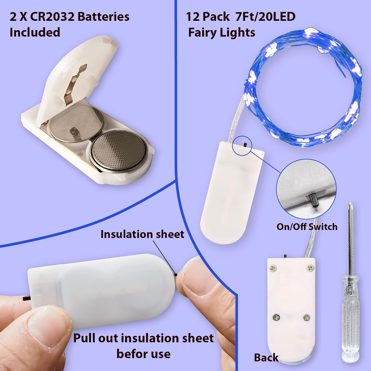 • 【Fantastic Blue Lights】: 12 separate mini fairy lights battery powered, made of 7ft high quality Silver coated copper wire, It’s flexible, strong and durable. Perfect for your crafts project , floral arrangements plants, signs, furniture glass jars, vases, wine bottles or other decorations.