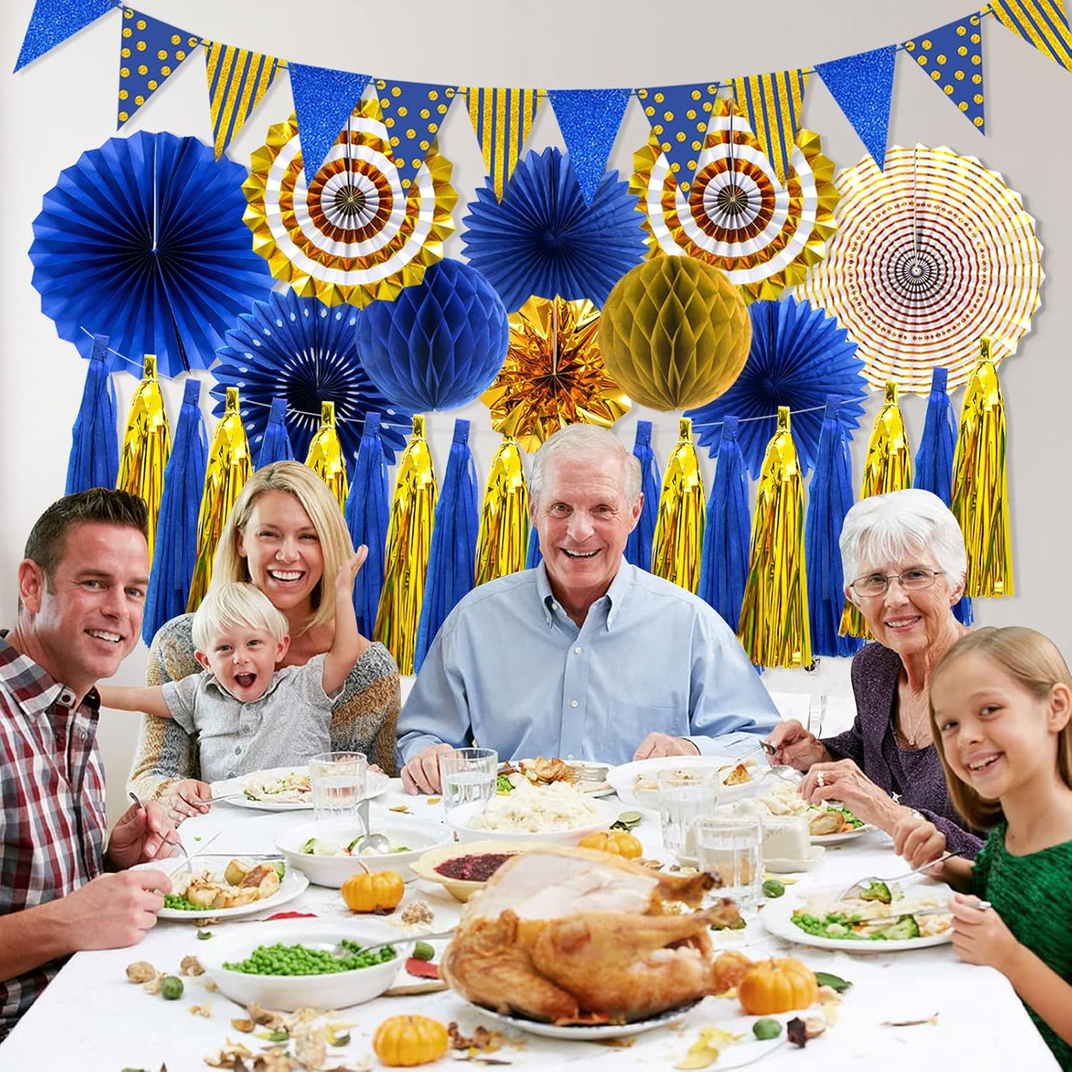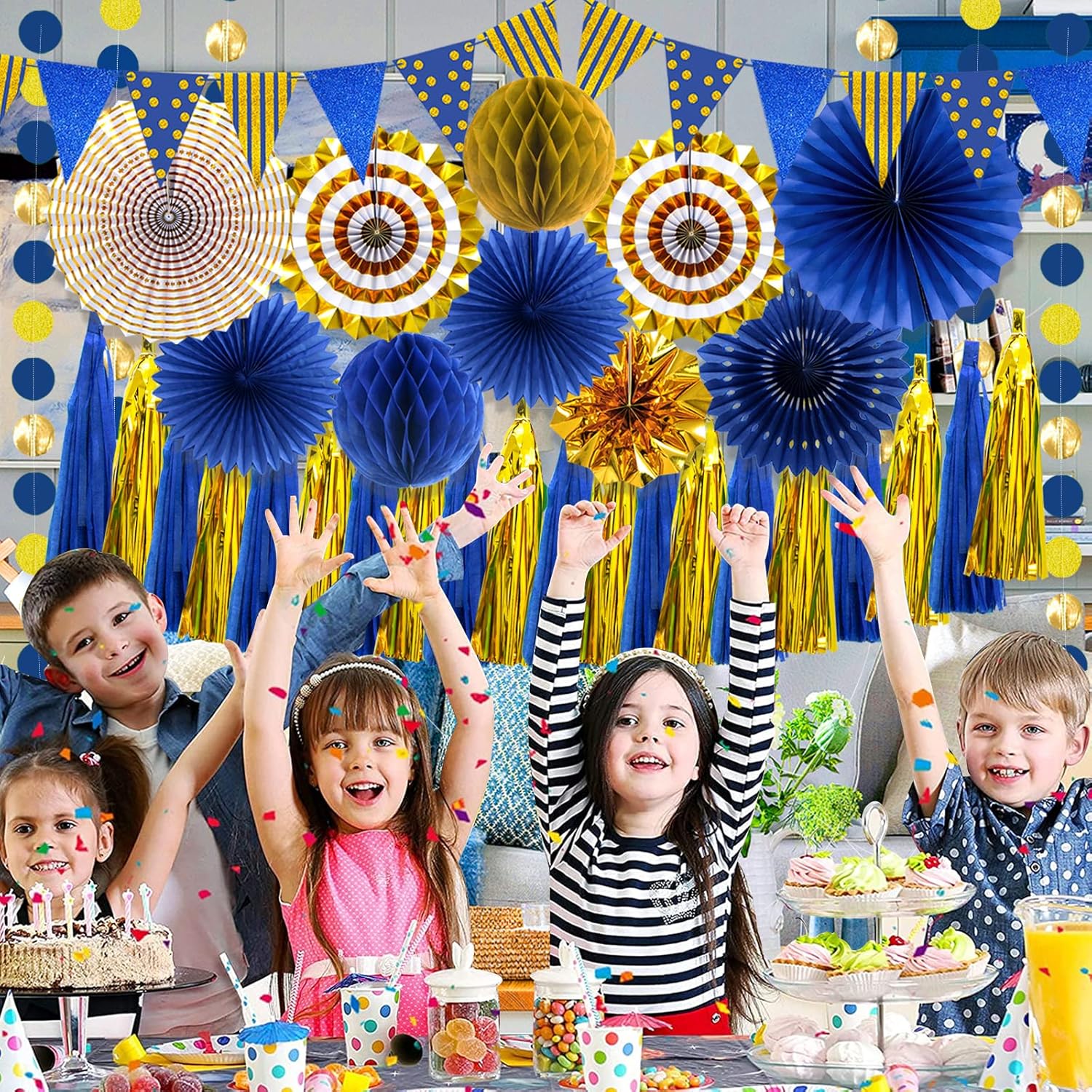 • Navy Blue Gold Party Kits: The party decorations kits include 8pcs hanging paper fans in diffrent size, 1pc 8.2ft blue gold triangle triangle flag banner, 3pcs 13.12ft circle dots paper garland, 2pcs 8inch honeycomb balls, 20pcs tassel garland. Total 34pcs.