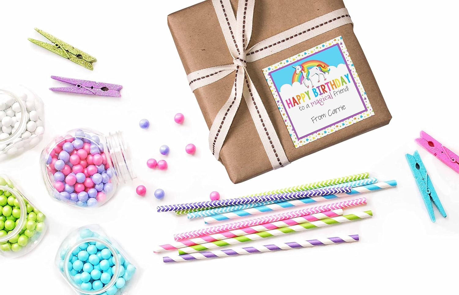 • Cuteness Overload: Designed by a talented mom, these colorful stickers feature a cute rainbow unicorn theme. The clever message of "magical" birthday wishes is the perfect way to honor the birthday boy or girl. Each sticker will be custom printed and personalized just for you! Amanda Creation. Original design by Amanda Creation.
