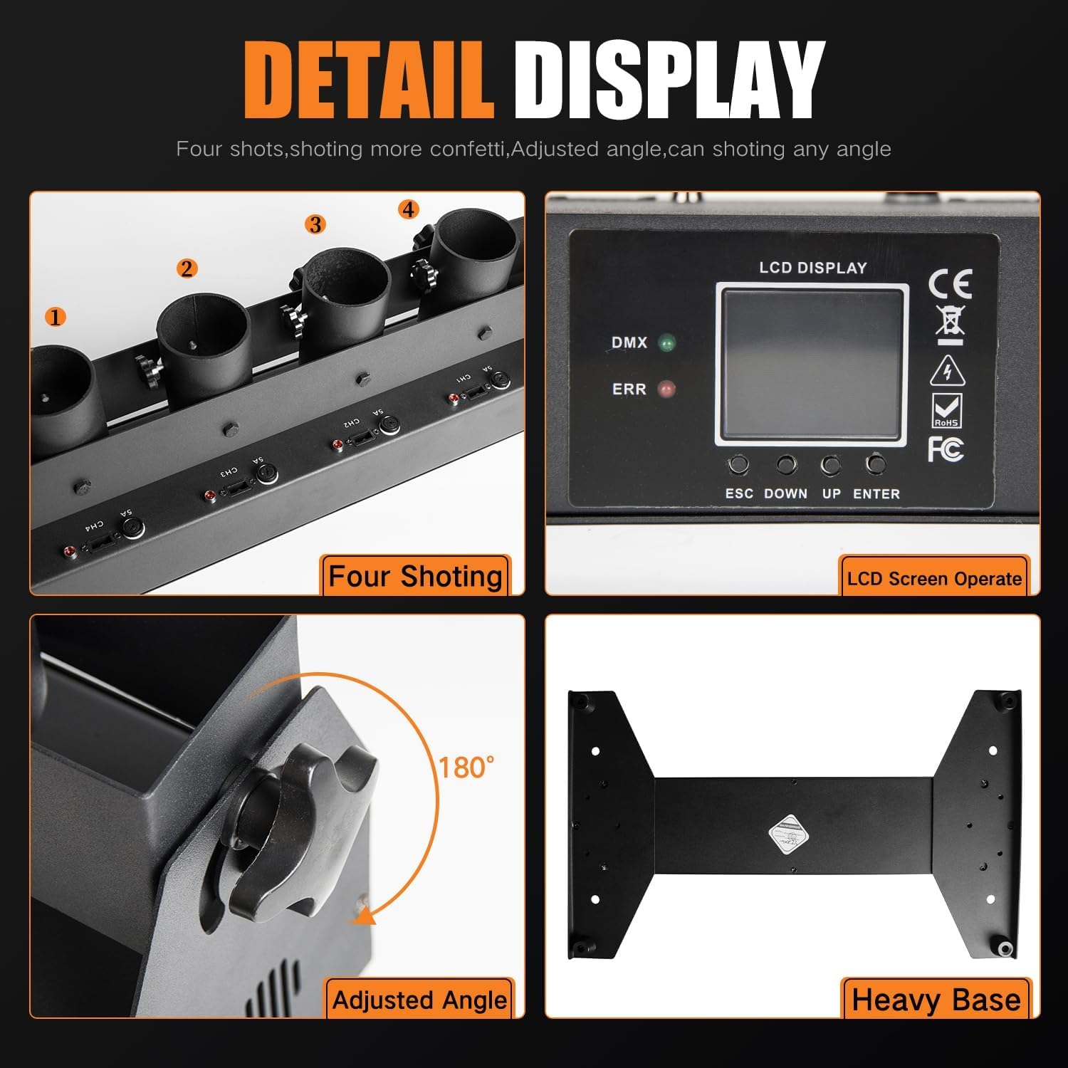 • The confetti Launcher can adjust the angle of the spray barrel, only need to adjust and fix the angle by hand. The adjustable angle of a single spray barrel is 180 degrees, and the two spray barrels can be in the same direction at the same time, or one front one back in a different angle adjustment