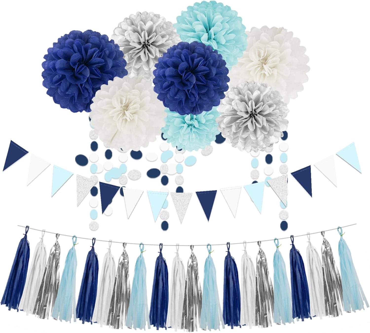 Teal Silver White Navy-Blue Party-Decorations - 30pcs Tissue Paper Flowers Pom Poms Tassel Garland Pennant Banner Flag Streamers Birthday Decorations Boy Men Christmas Baby Shower Winter Hanging Decor